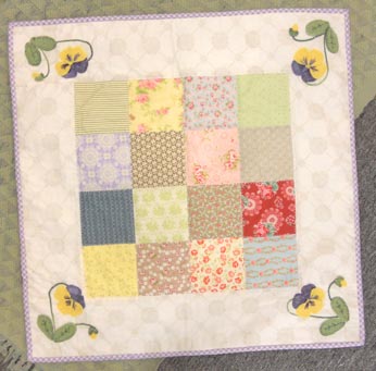 This project is based on Milk and Cookies but with a garden-style spin on things. we appliqued pansy flowers and buds to each corner and featured cottage chic prints and colors…