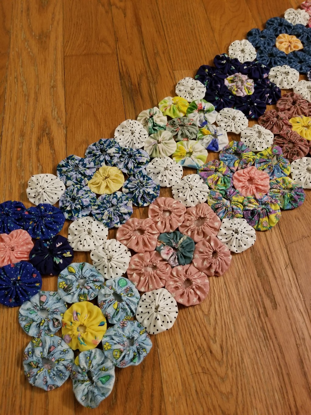 the original quilter who stitched the yoyos/puffs wasn’t consistent (maybe she’s a long lost relative) so my yoyos are a little smaller than some of hers but it has made it easier to fit them in in between the flowers.