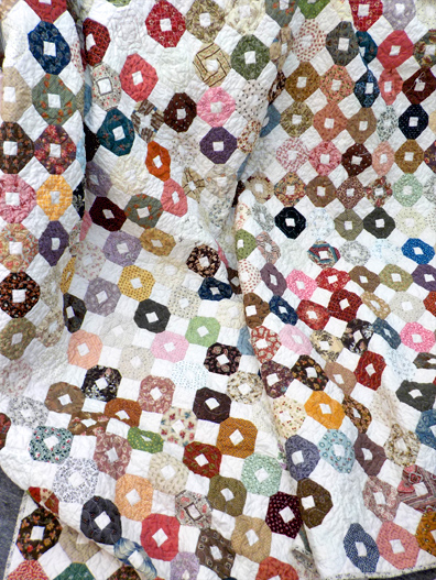 the quilt has a total of 504 little primroses and features some new prints i picked at the Madison Quilt Expo and some of my favorite prints from my stash…