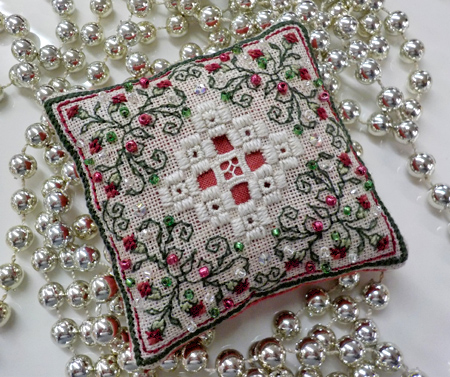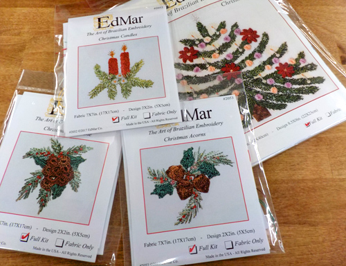 if this embroidered/quilty pillow isn’t really your thing…we also have EdMar Christmas kits available…kits include all the threads (including metallic if needed), beads, preprinted pattern on white, needles, and complete instructions.