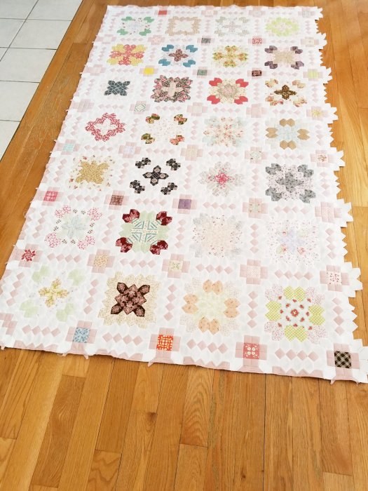 I’m halfway! i had originally planned on having it done by my birthday (today) but that didn’t really work out…however, i do have all the pink around all the 4-patch cornerstones and 18 or so sashings stitched. I’m getting impatient now when it comes to the sashings and cornerstones so i think i’m going to go through and piece all those so i can just go to town on stitching on the blocks.
