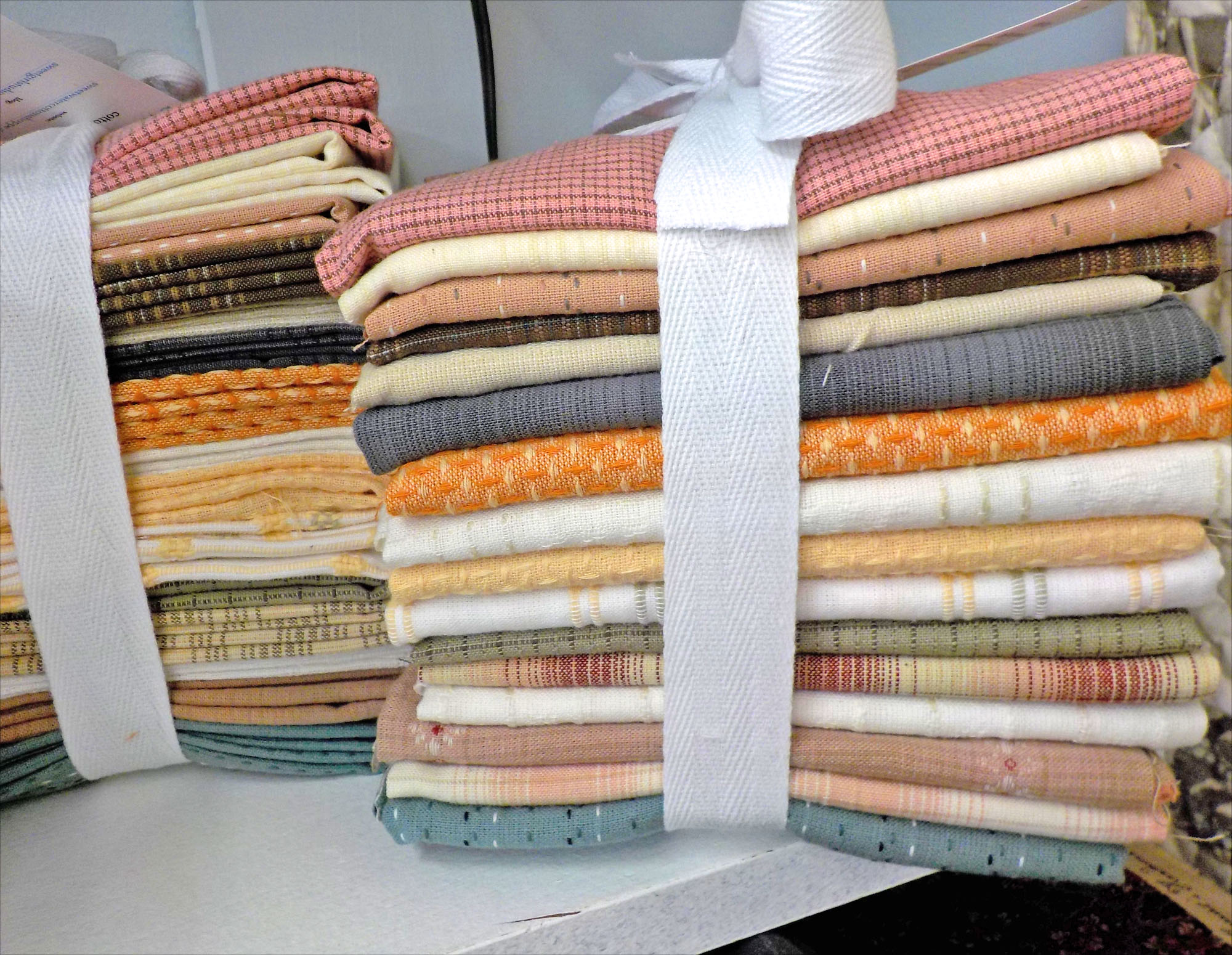 anyways…we are now back in the sewing of things. Orders arrived while we were gone. Some wool from In the Patch Designs: Pennies, Hex-A-Gons, and some Smidgens. Swell Christmas panels and bundles (i’ll be whipping up more kits of the Swell Dresden Pillow before the hop), Diamond Textiles…yardage and tons of 3 1/2 inch and 5 inch charm packs, and some Durham Collection…mostly blues on a soft creamy tan…scrumptious! We have some curated bundles available now….