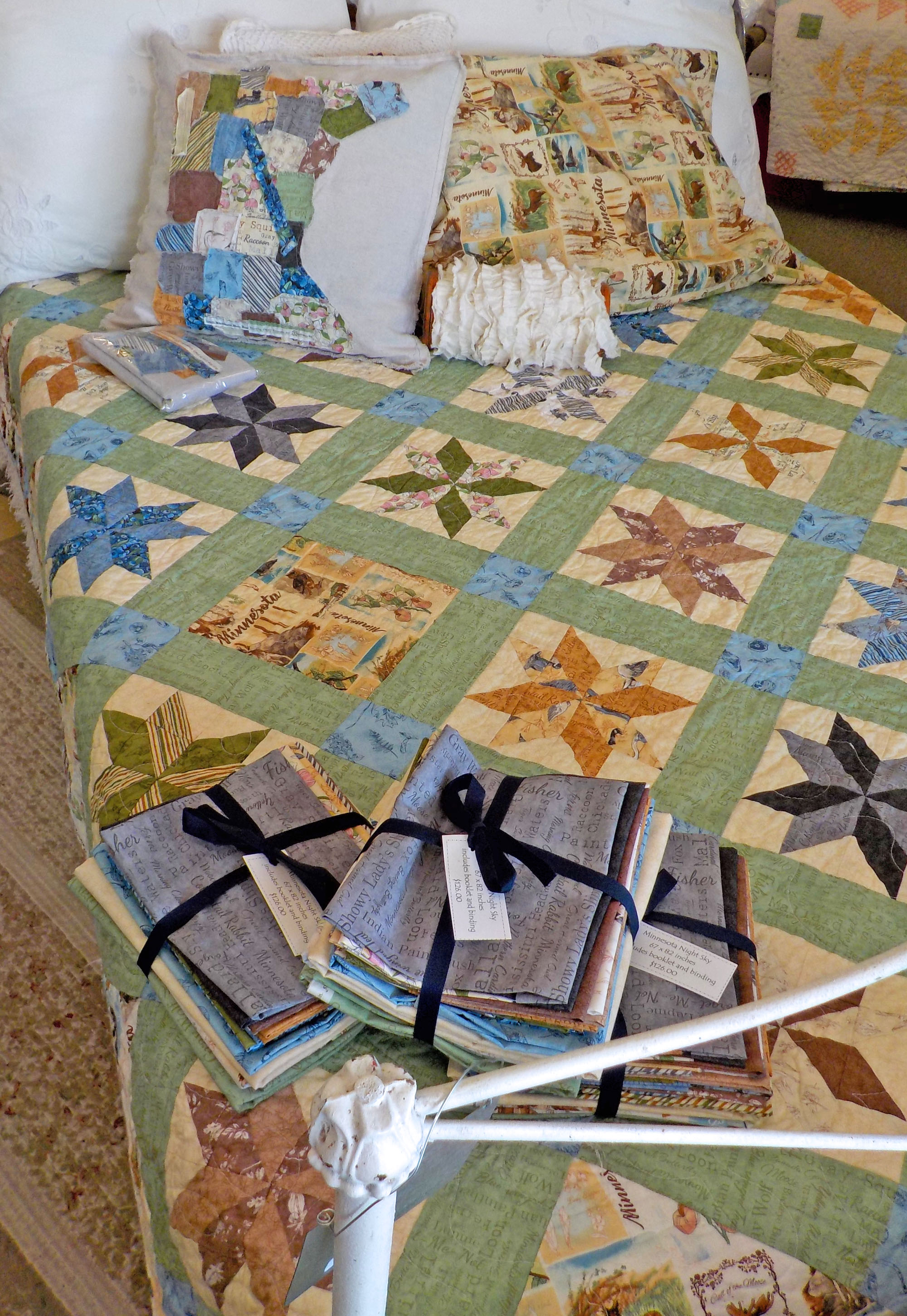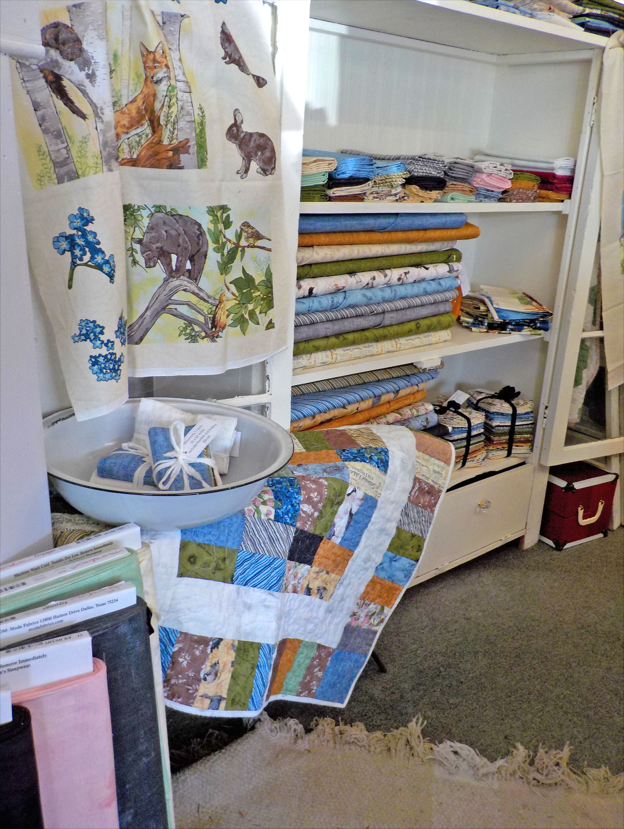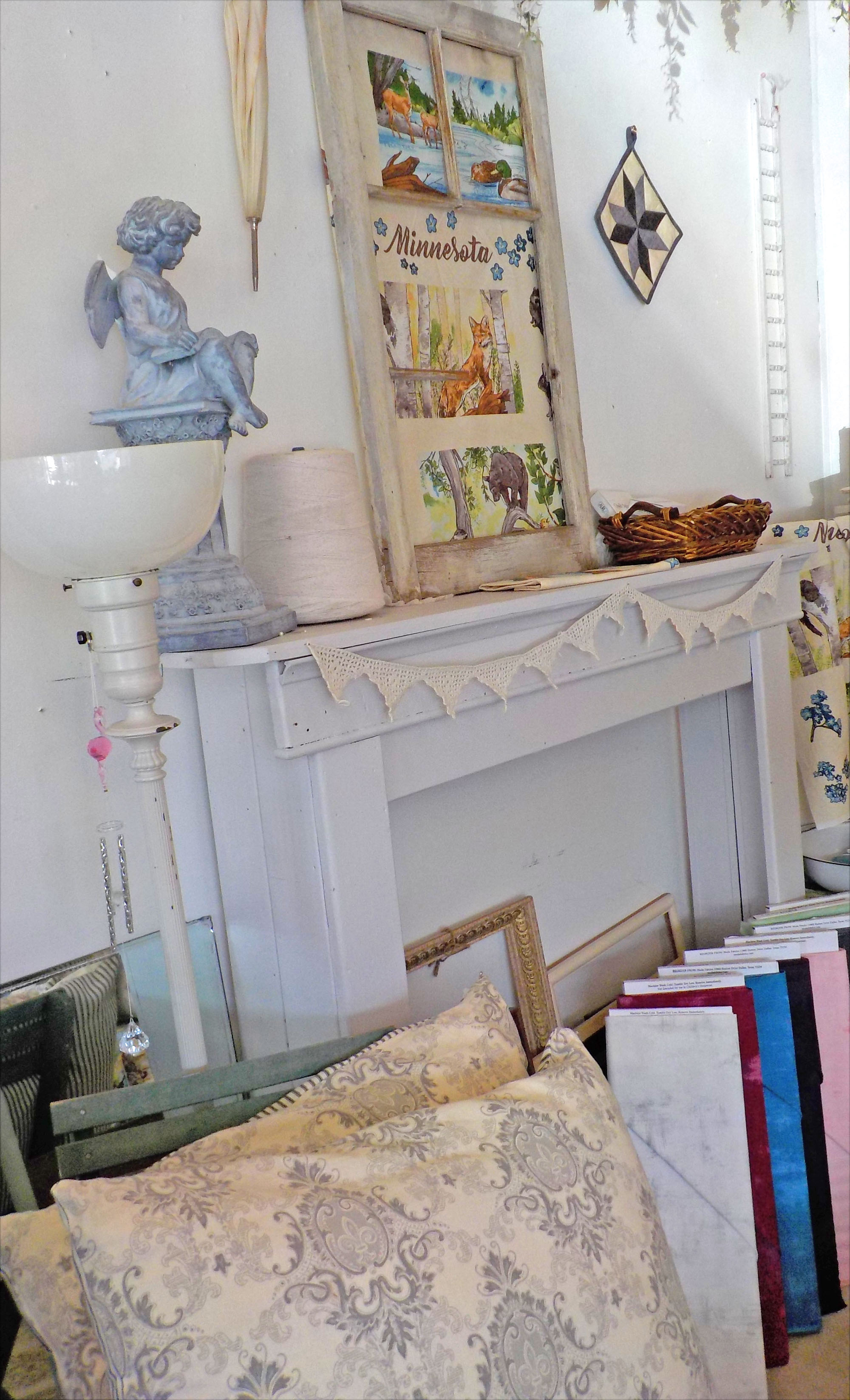 our window display features a cozy bed, classic mantle and a cupboard full of quilt minnesota 2019 bolts, 1 yard cuts, fat quarters, and bundles.