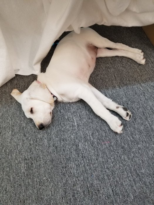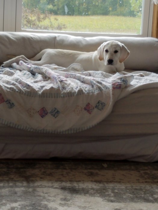 oh…and a picture of gabby goo who can now get on the furniture all by herself…this is her on the daybed in the living room.