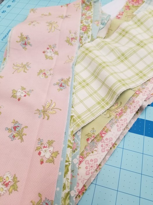 needless to say…the window is still semi-valentine’s day. not quite changed over to easter. we did start a new project using Brenda Riddle’s Bramble Cottage collection. remember Bliss? basic strips and piping…it is one of our favorites. we are so excited to see it made up again!