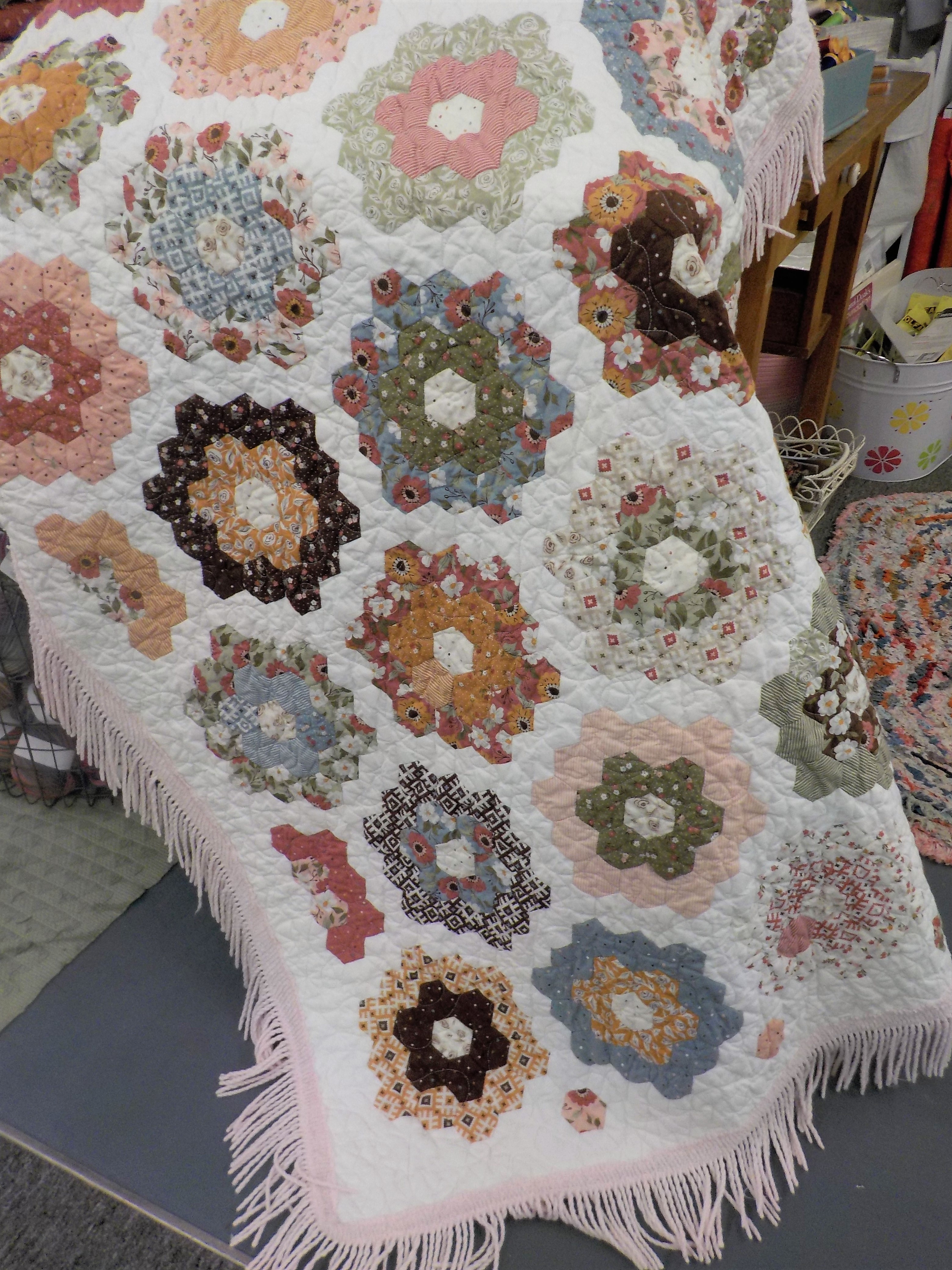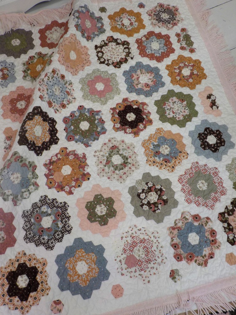 good afternoon! i’ve finished my folktale jelly garden…and i am loving it! it is totally my palette…dusky autumn tones of pink, blue, brown, white, and gold, and i finished it off with a soft pink chenille bedspread fringe…classic and sweet. hopefully i can remember to bring it home tomorrow so i can enjoy it on thanksgiving.
