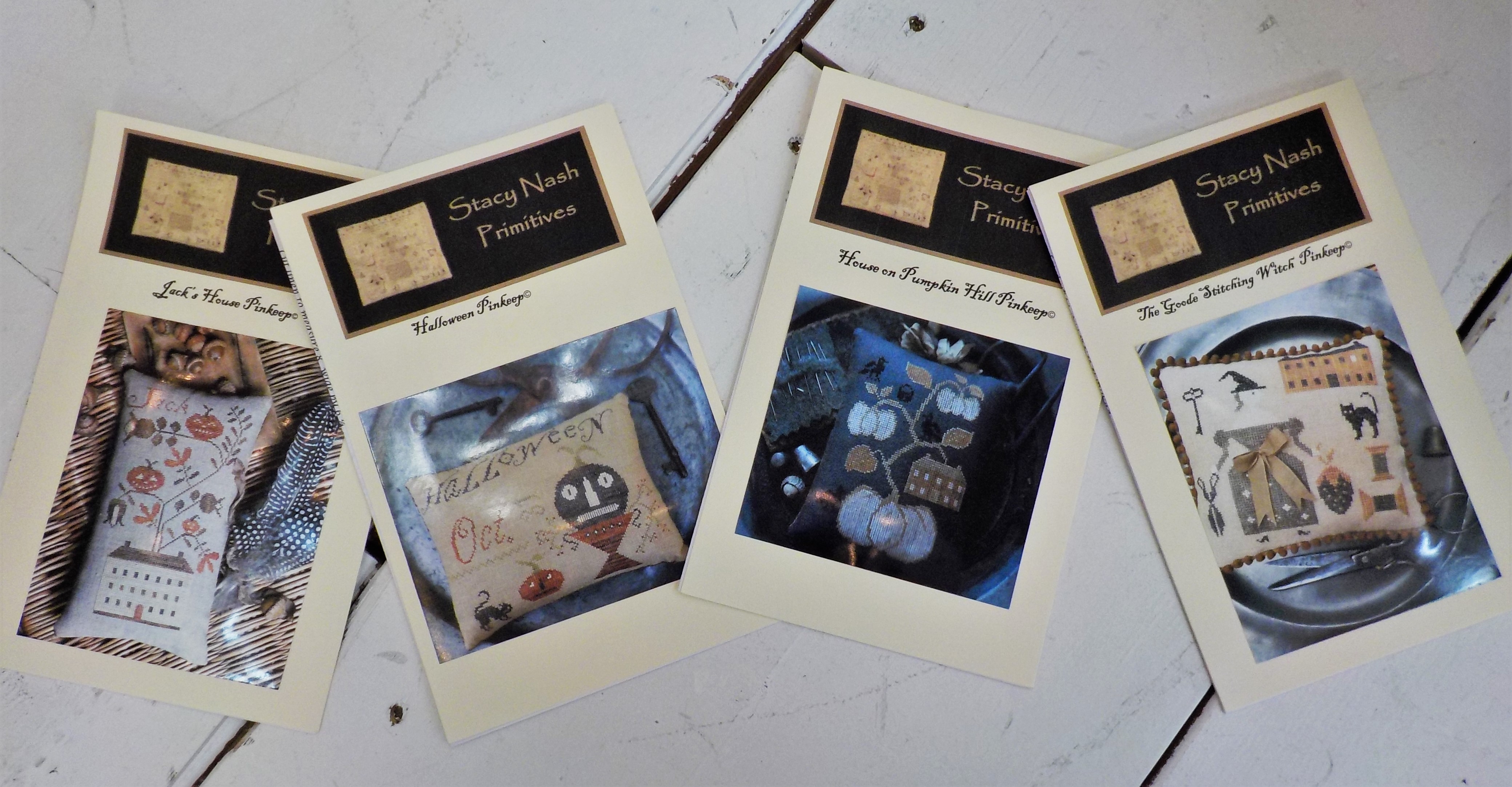 some stacy nash halloween cross stitch has arrived! mom has already set to work on Jack’s House Pinkeep (far left).