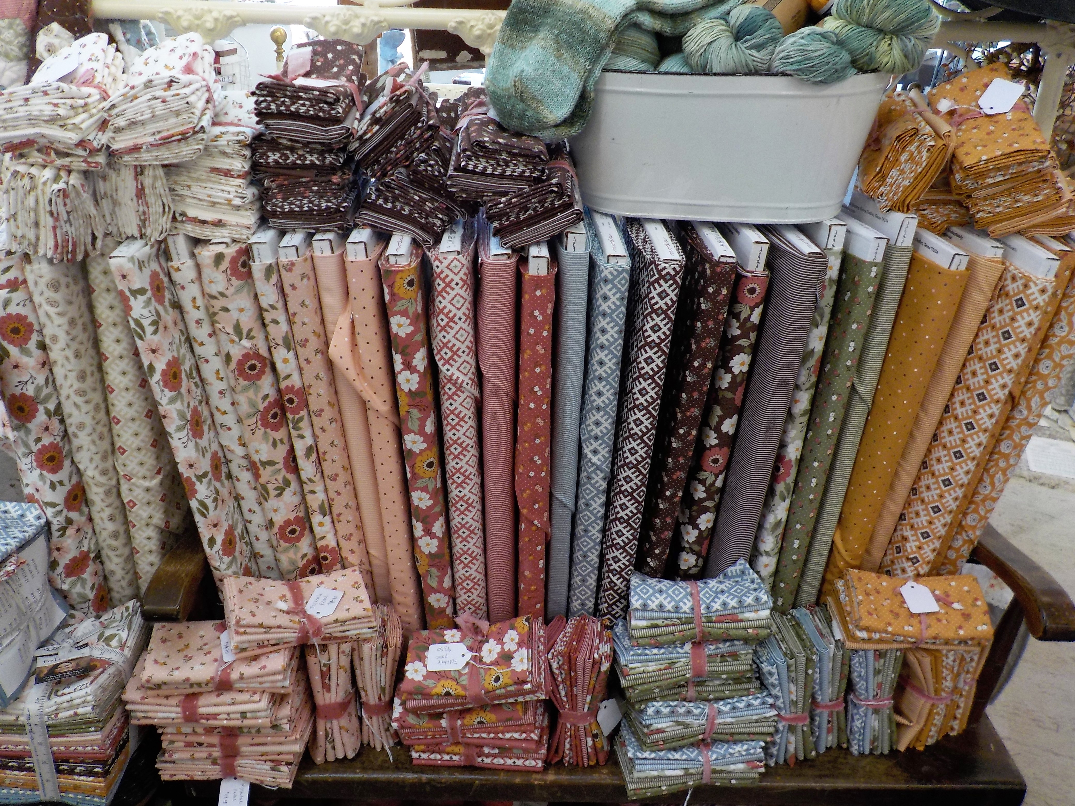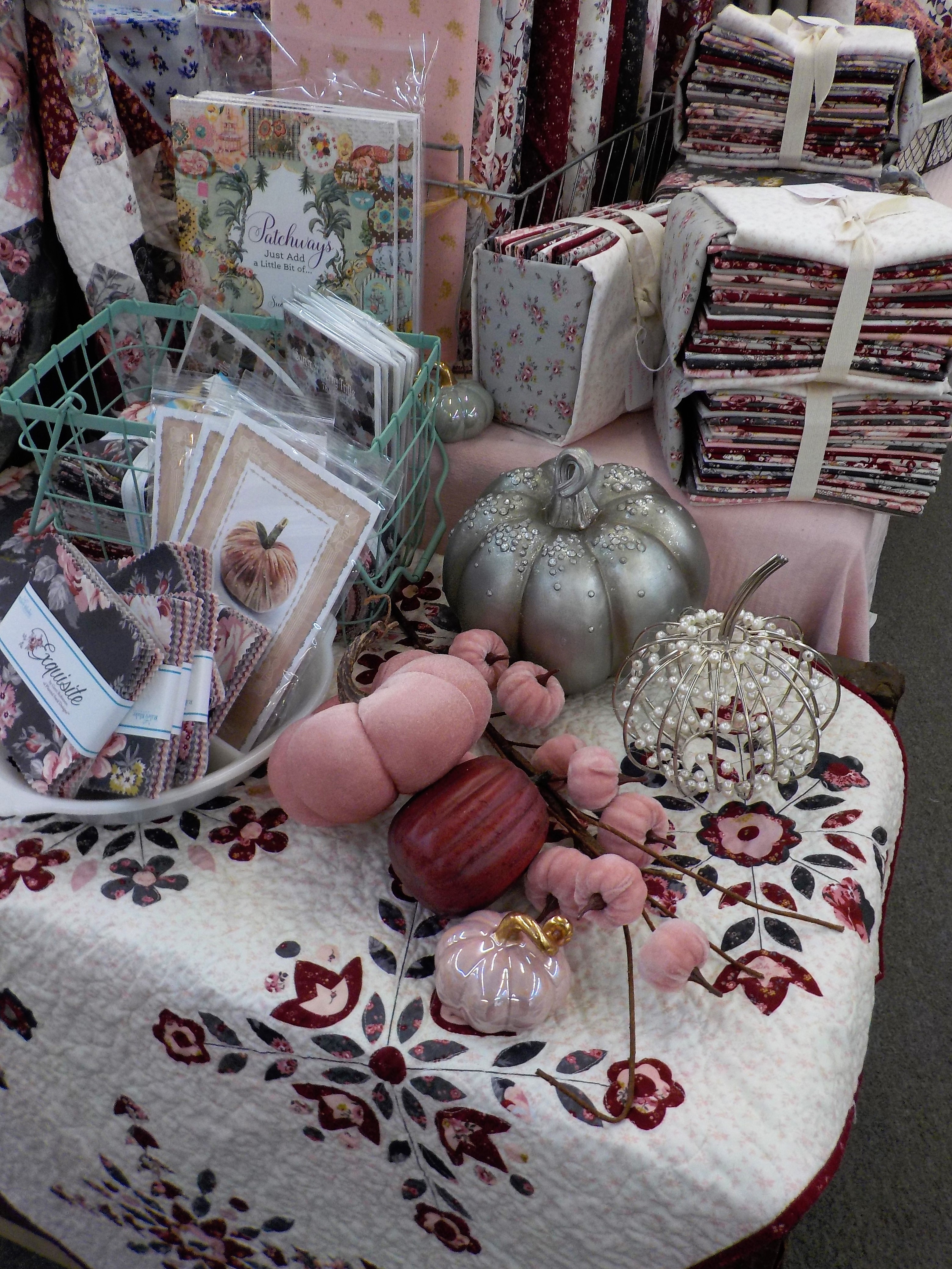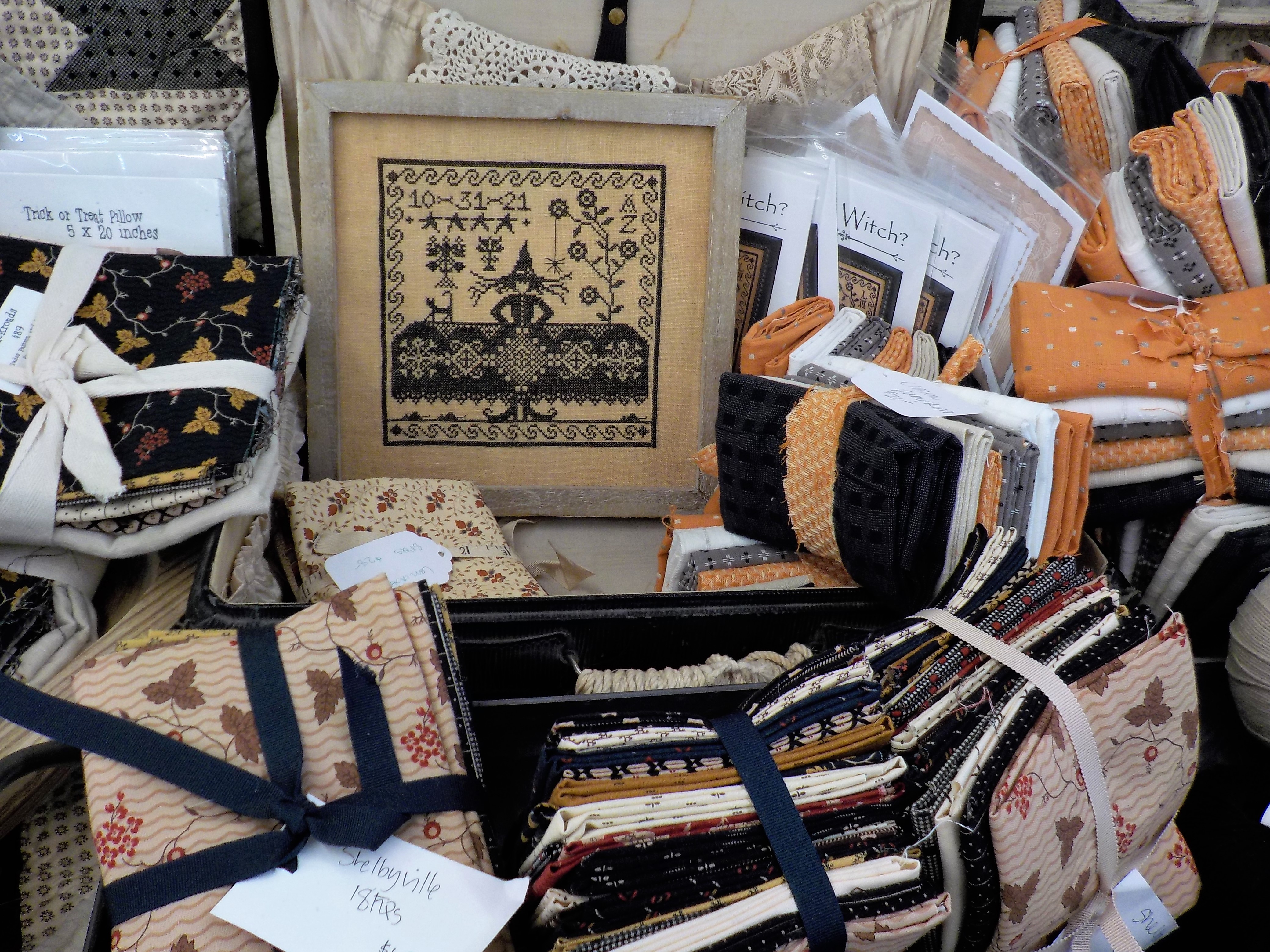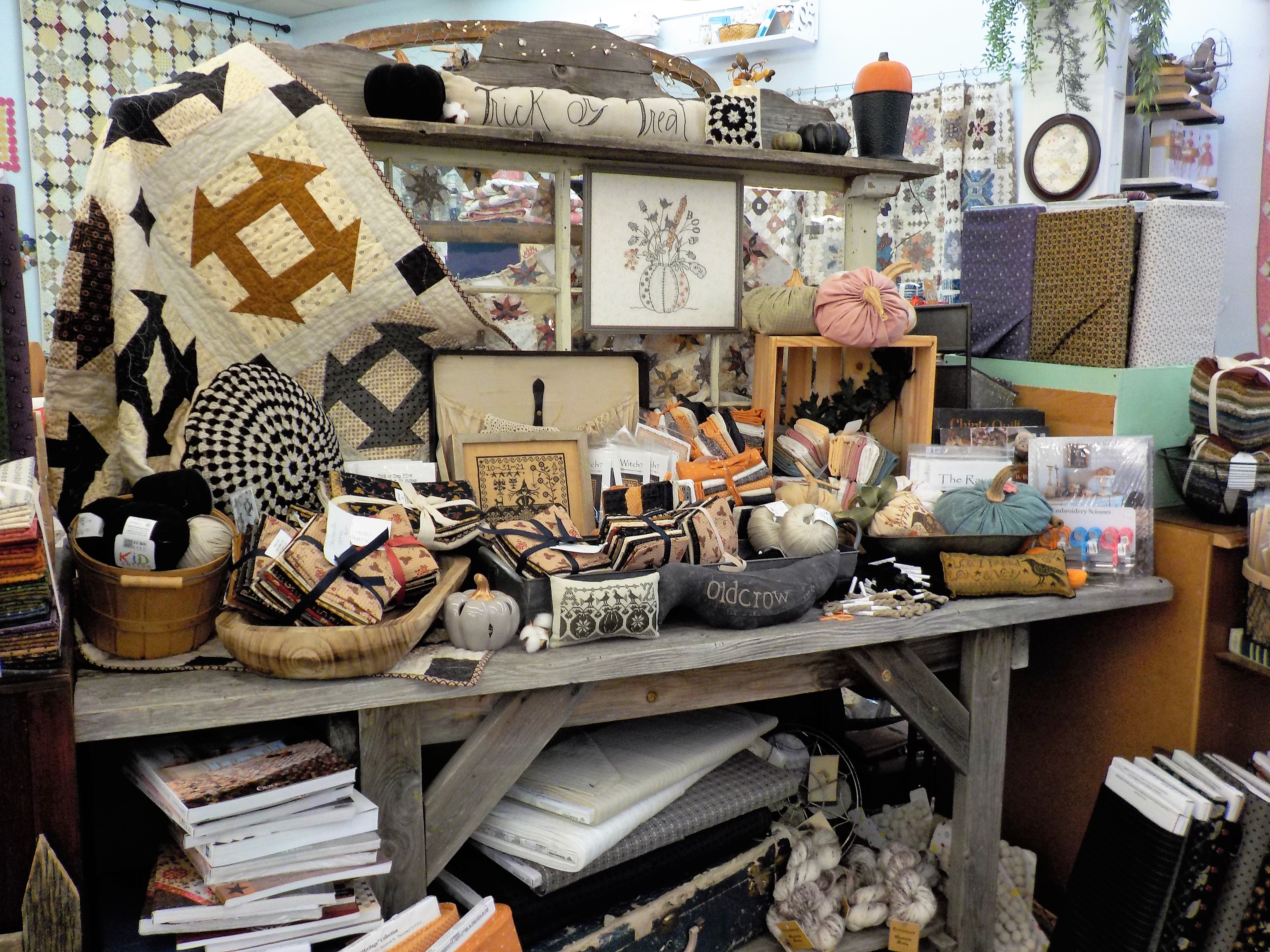i thought i would start with one of my favorite displays in the shop right now. it highlights almost all the extra goodies we carry…a little quilting, crochet, embroidery, and cross stitch.