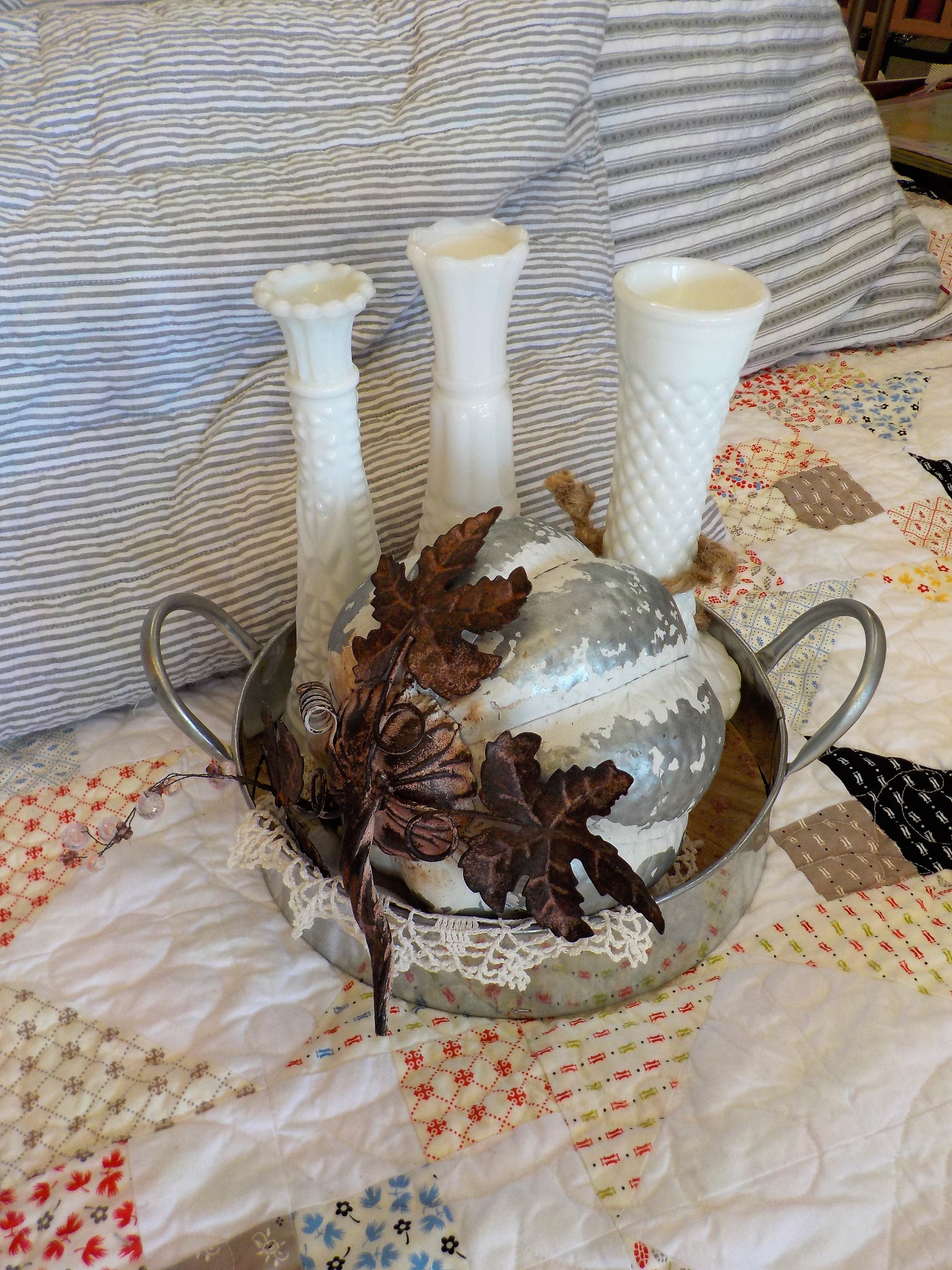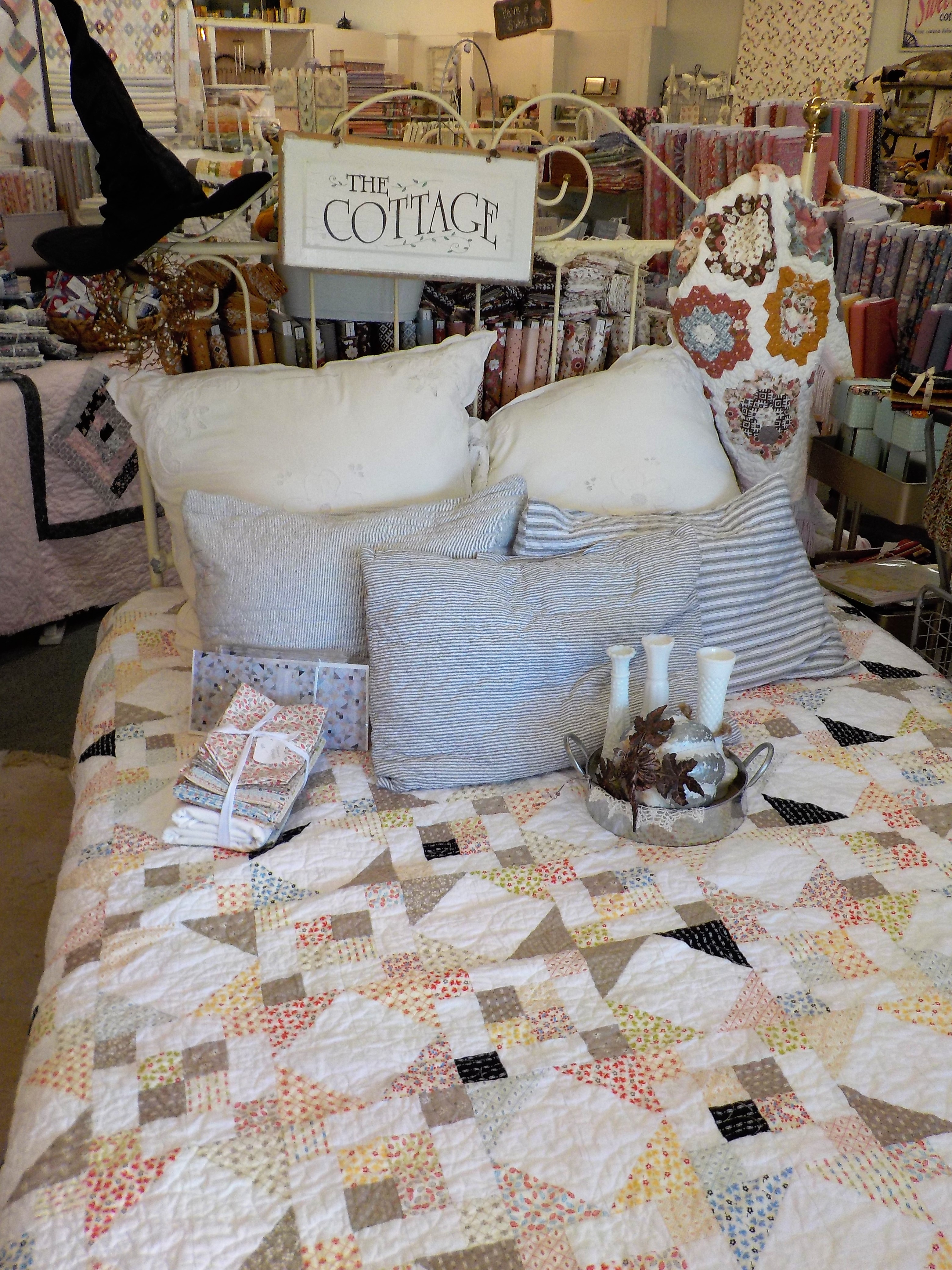 the bed in the window. Summer Breeze shines with Figs & Shirtings prints and that black and grey give it that extra somethin-somethin…i love it piled with pillows and a classic and simple tray with a silvery pumpkin and milk glass vases.