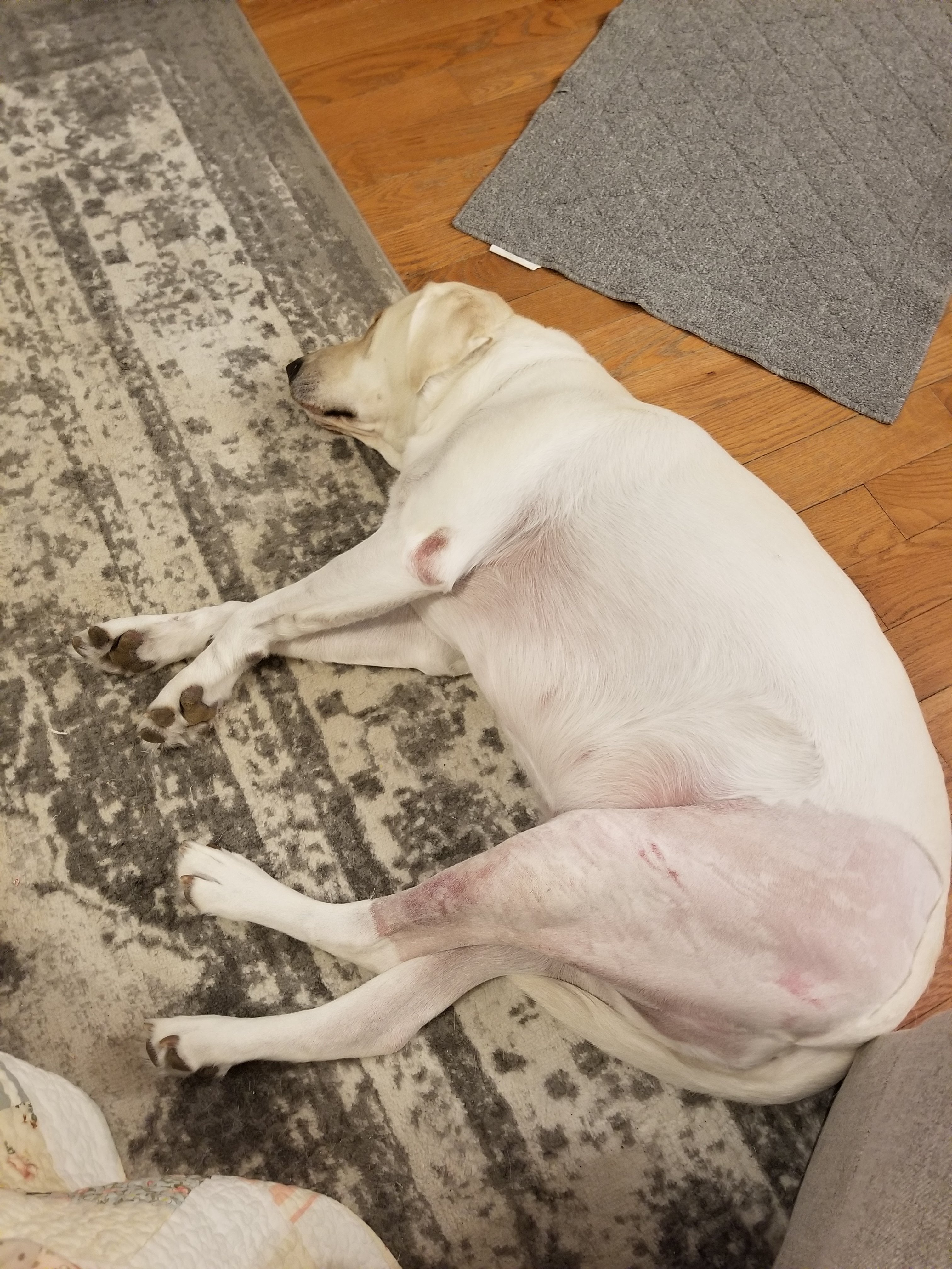 now for a gabby update before i head home. many of you know, gabby tore her right ACL over the summer. it was a minor tear that with therapy and rest healed up just fine. then the sunday before Christmas, we were gone all day and when we got home she was running around outside (like a crazy lady) and when she came in she wouldn’t put any weight on it. mom took her to see dr. Wendy on the following tuesday after zero improvement on monday. it turns out she tore her ACL in her left leg. So…she has now had surgery (January 10th) and came home the next day. recovery will be between 4-6 months depending…lots of walking, relaxing, ice packs, heat compresses, i’m sure you know the drill… she still tries to jump in and out of the car and at 89lbs you can’t just scoop her up. she will be coming to work but only on days that mom and i are both here…(Monday, Wednesday, Friday, and Saturday). we hope you have a chance to stop and by and say hi!