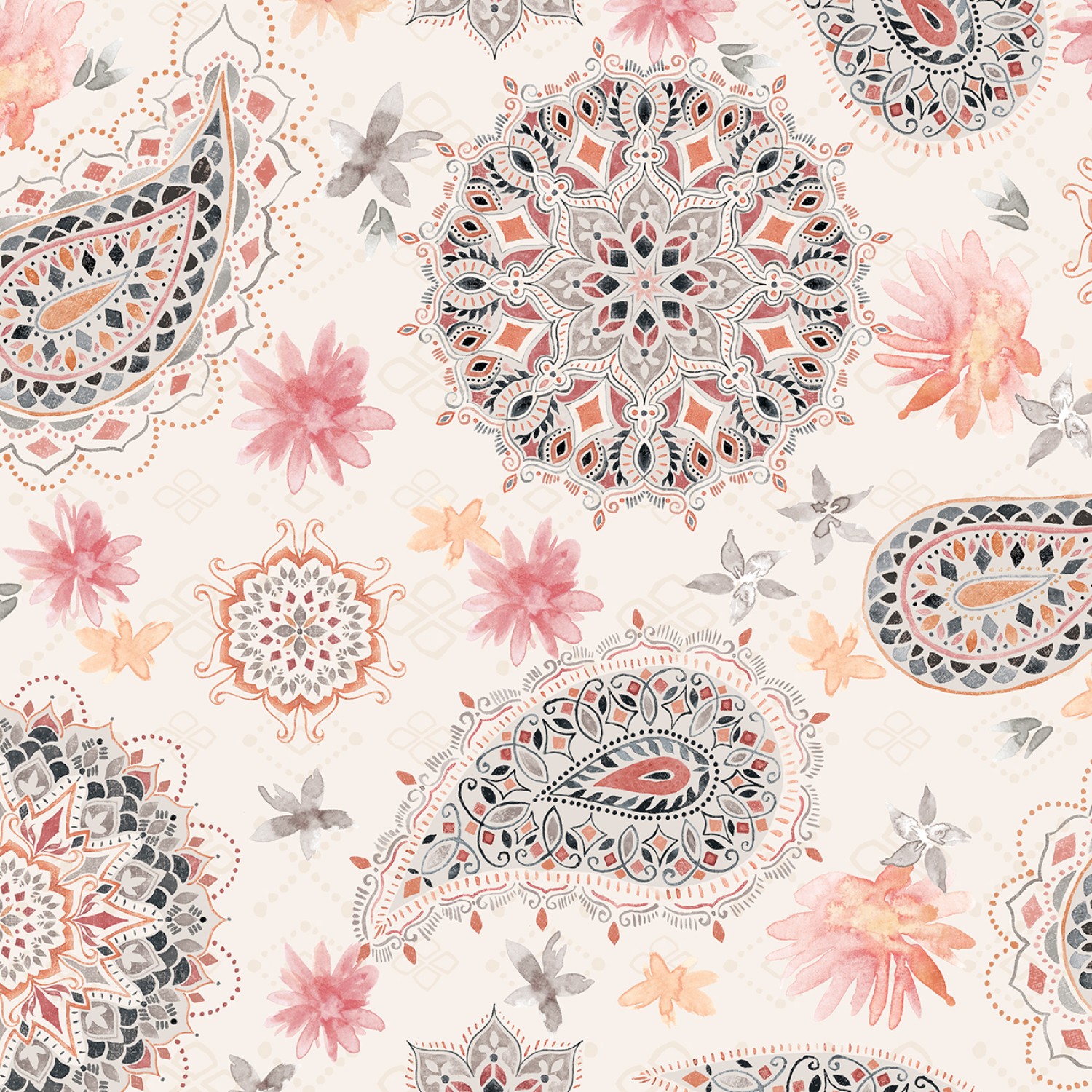 Paisley Place…featuring shades of peach sherbet, rose, vanilla, grey, and black…this collection has a watercolor look to it. soft, gentle paisleys and mandalas offset with black. Perfectly pretty!