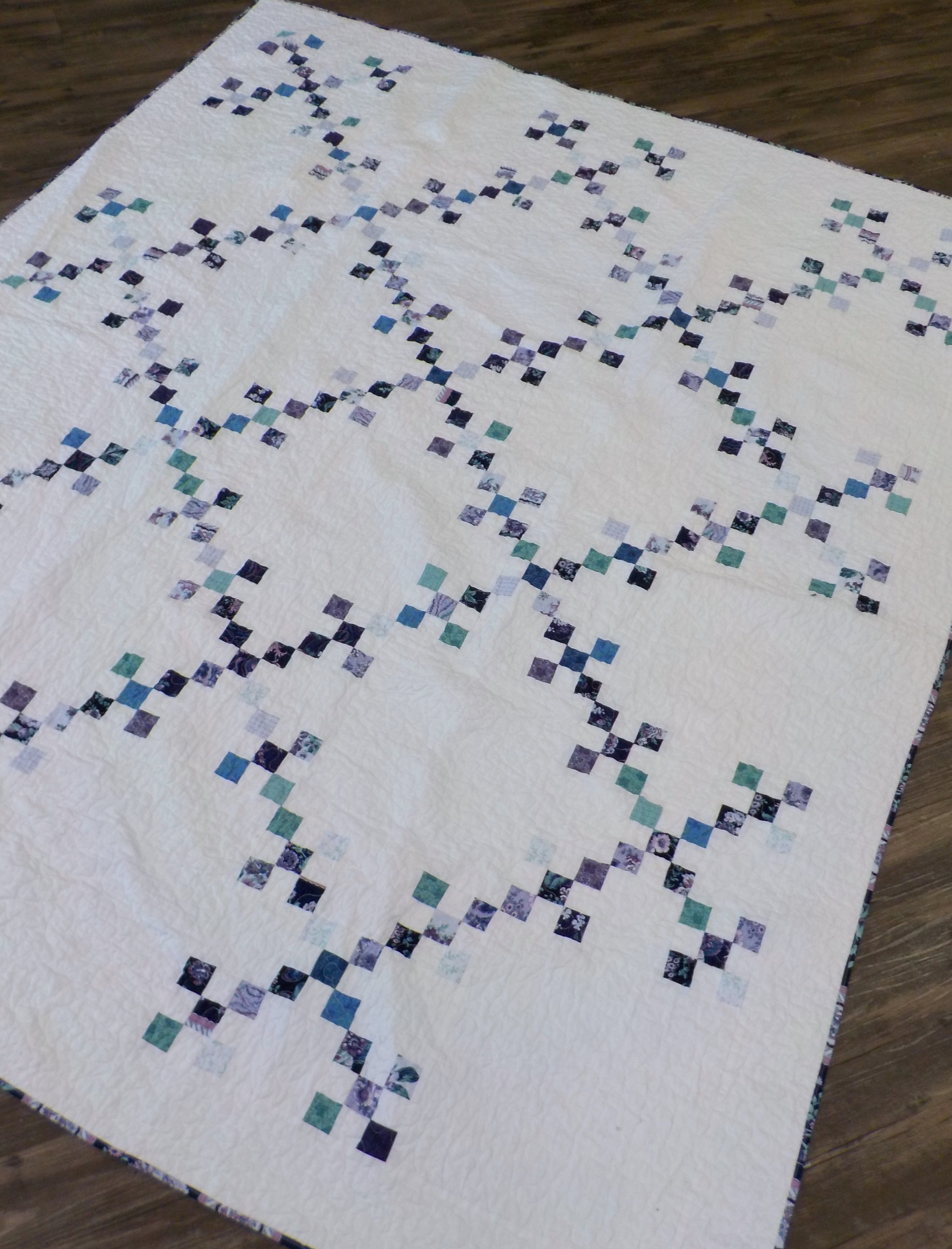 classic and sweet…these little 9-patches are perfect with these violet, lavender, purple, teal, and blue tones. Paired with white…these prints just perfect!