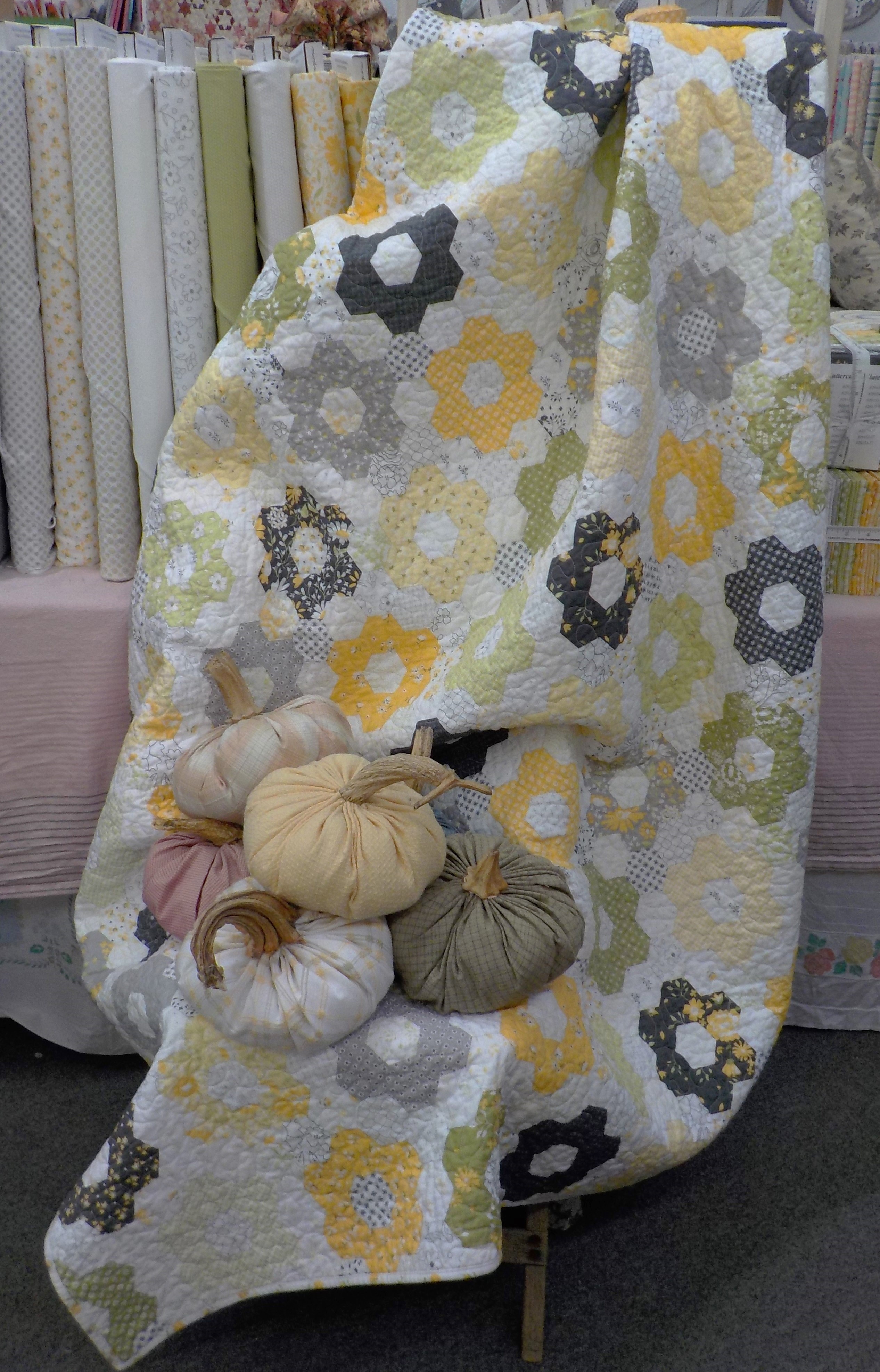 if you want to whip up our Buttercup Hexie Cheater Quilt…the kit is available now…you can find it here.