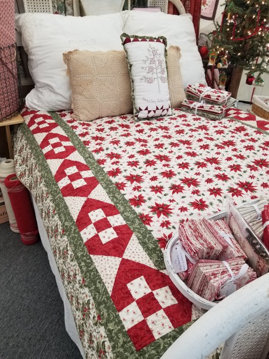 today i thought i would share Kandii Plaza featuring Poinsettia Plaza by 3 Sisters. This project is a revisit of a pattern we did long ago (Peppermint Candy was a circa 2015 pattern). we thought it was time for an upgrade…and what better collection then the newest Christmas collection by 3 Sisters.