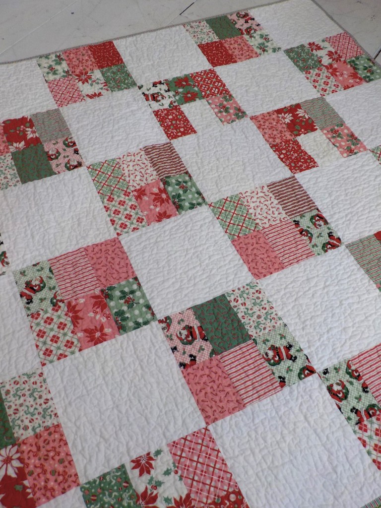 Twinkle Lights…inspired by a vintage quilt we spied in a cottage coffee table book. This little 6-patch block works wonders for the sweet little prints of featured in the Holly Jolly collection by Urban Chiks. The retro prints of Holly Jolly are perfect with the white alternating squares making this little quilt a favorite for the Christmas season. Measuring 54 x 54 inches it is perfect for the back of the couch, the chair by the fireplace or on the floor for a Christmas picnic.
