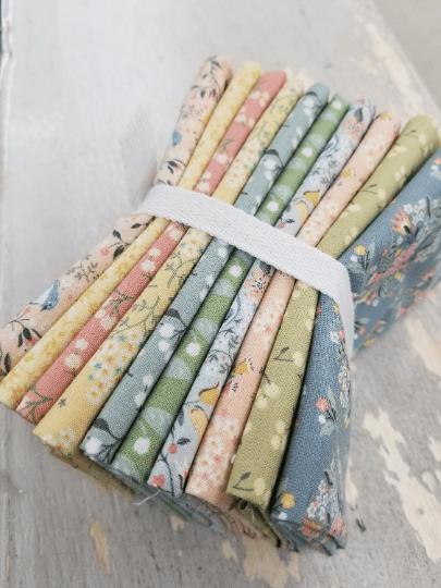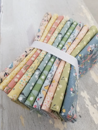 a lovely combination of springtime birds and flowers paired with a soft and subtle palette of blue, green, yellow, and pink. Reminiscent of the first flowers of spring, the buds on the trees, and the chirping birds. This collection is perfect for spring/Easter decorating…whip up a throw quilt, table runner, wall hanging or bed quilt for the spare room.