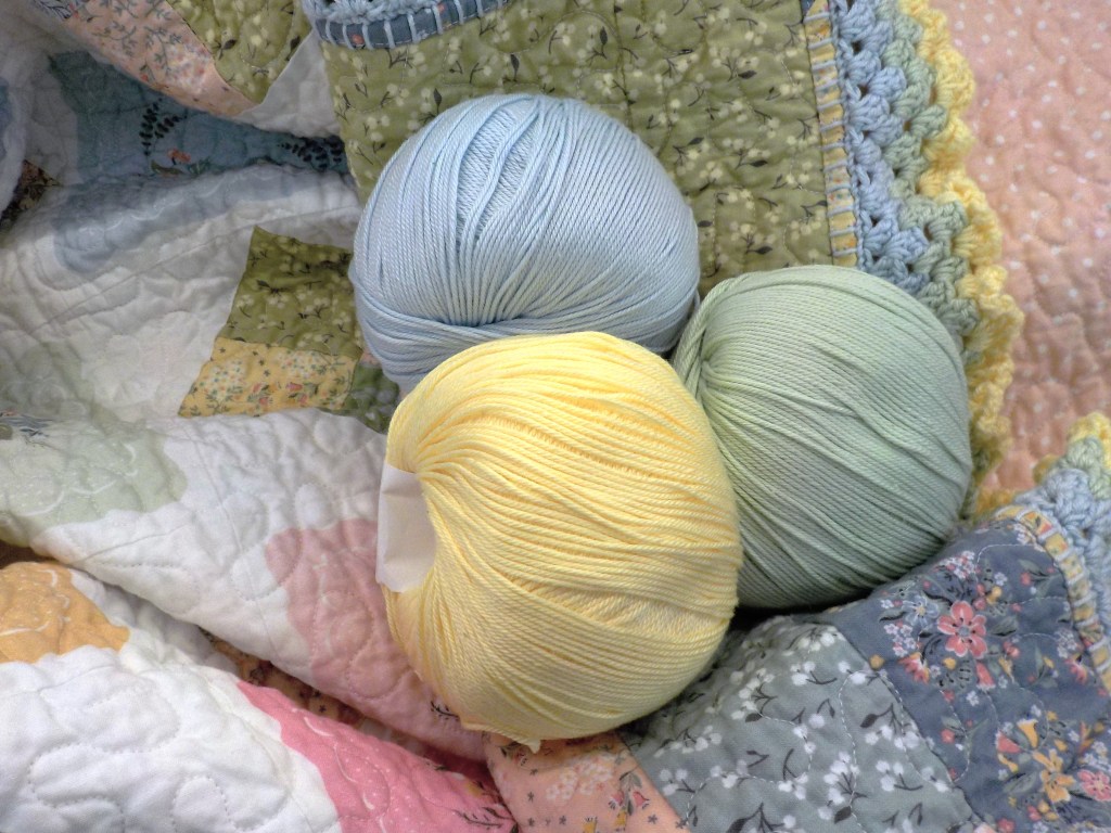 Springtime Sing-Along features classic 4-patches, a solid white, hankies, and lovely frilly crochet in a palette of mint, sky, and soft lemon.