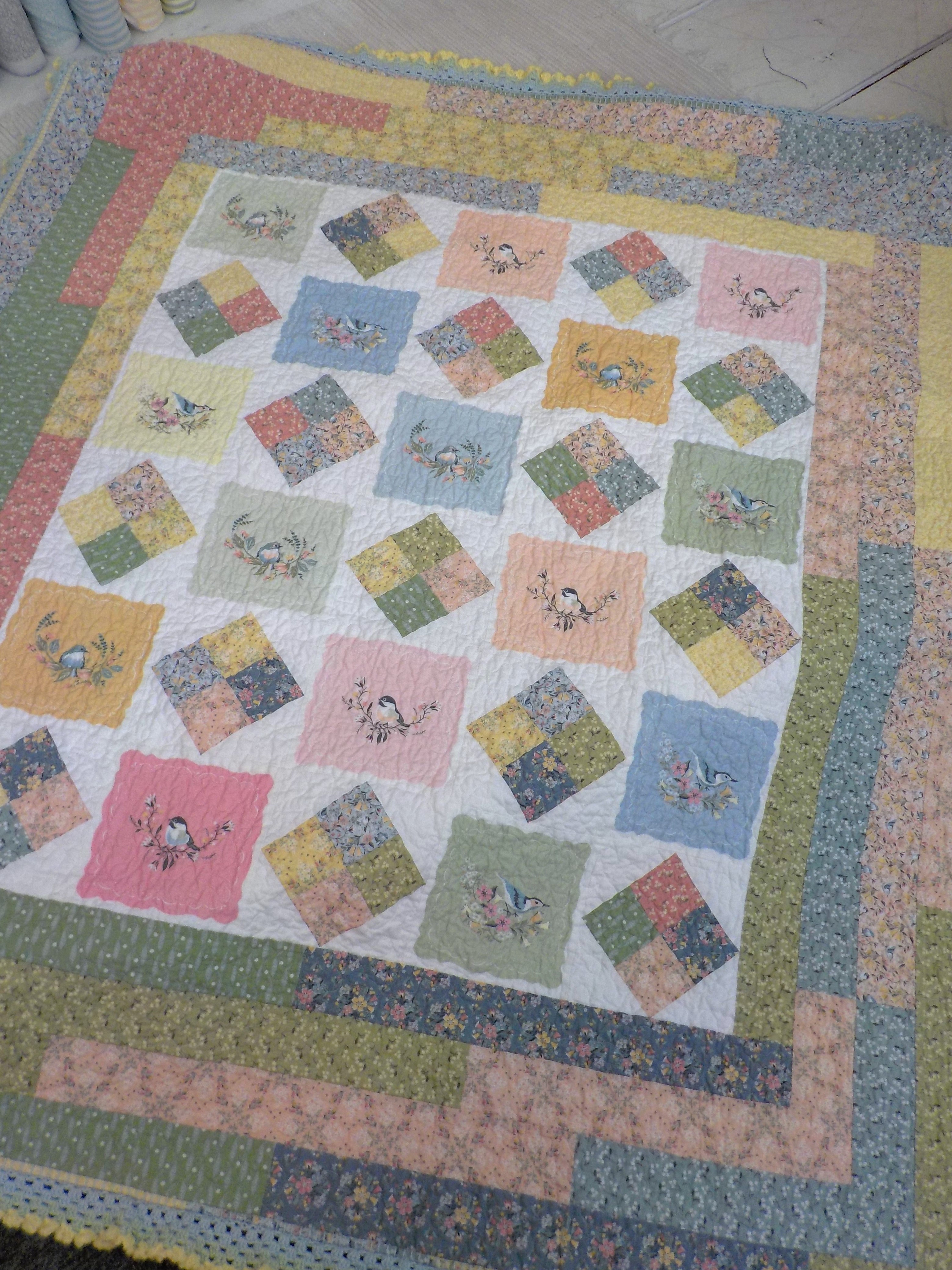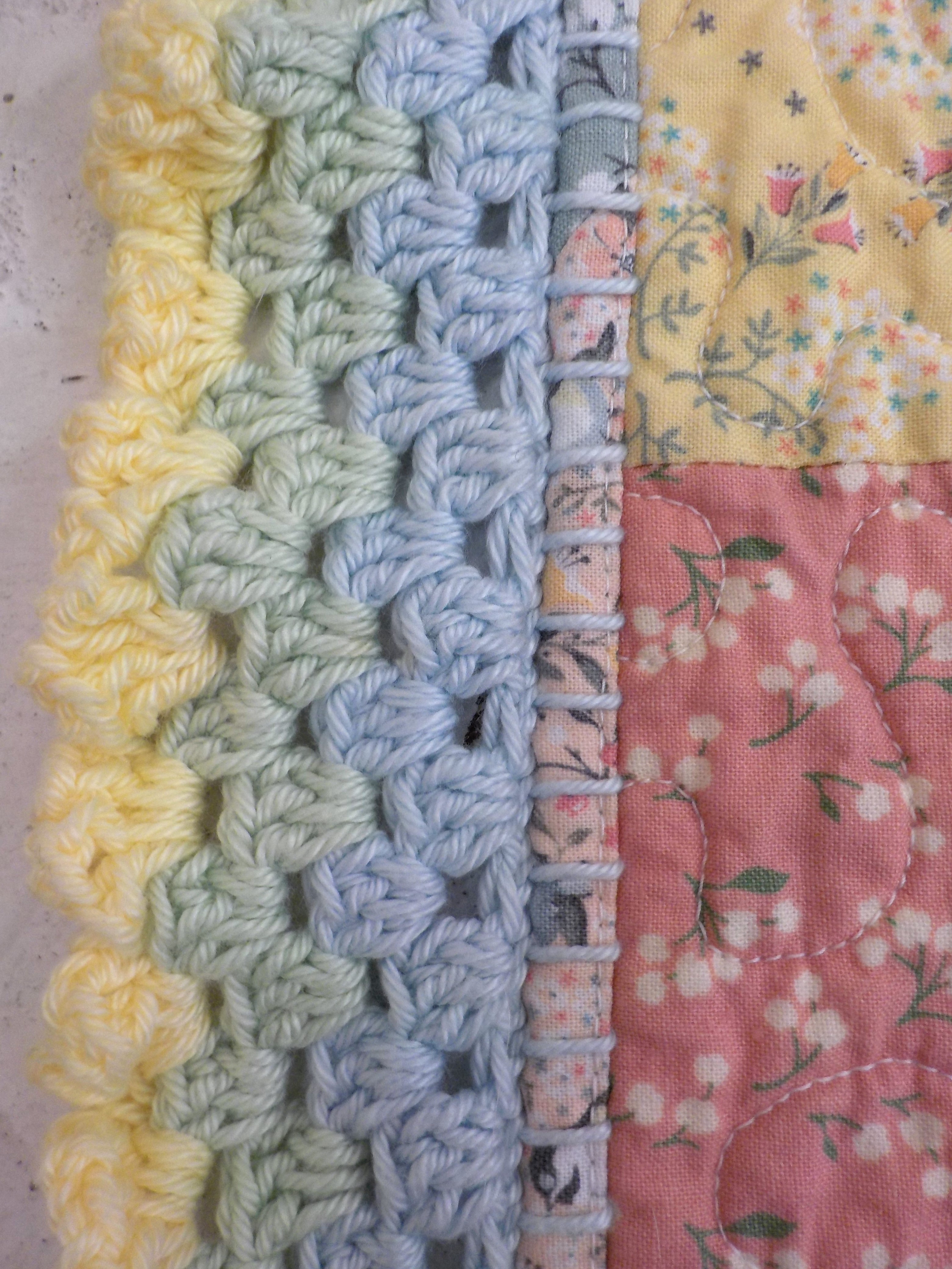 Springtime Sing-Along features classic 4-patches, a solid white, hankies, and lovely frilly crochet in a palette of mint, sky, and soft lemon.