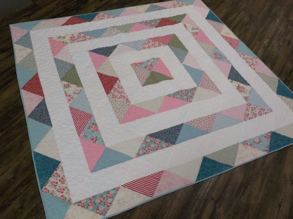 today i would like to introduce our Hard Candy quilt. Hard Candy features Wish You Were Here by Whistler Studios, a collection that features lovely florals, sweet little ginghams, stripes, dots, and tonals in a palette that is absolutely dreamy…rose, blush, ruby, teal, blue, cream, and a touch of green. a must-have if you are looking for a cottage quilt with a little modern twist. Simple half-square triangles with only a little bias when adding in the setting triangles.
