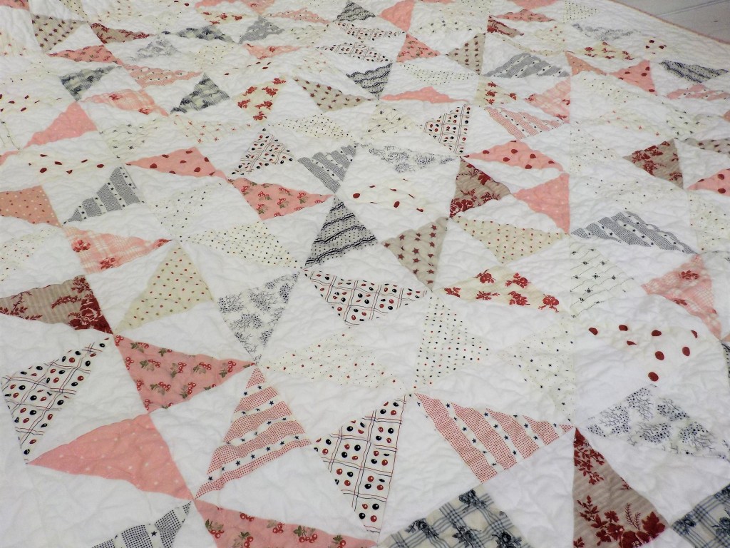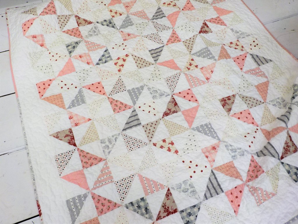 I thought today would be a good day to introduce Patriotic Chintz. This delightful large throw uses a mixture of Minick and Simpson collections…low volumes, blues, tans, and pink. We stayed away from deep reds so it would have a faded, sun-washed feel to it. Simple and Classic half-square triangles make up the main part of the quilt and bring to mind a field of pinwheels. A soothing white border and scrappy binding keep your eye on the center. the size 65 x 74 inches makes it perfect to drape over your white chenille bedspread or over a railing for a sweet touch of patriotism.