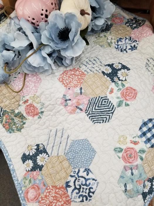 i quilted the preprinted hexie and bound it into a tablerunner…it is so lovely. when i pulled out our pumpkins i found these blue poppy silk flowers and thought they looked lovely with the pink and cream pumpkins. we’ve kitted it here.