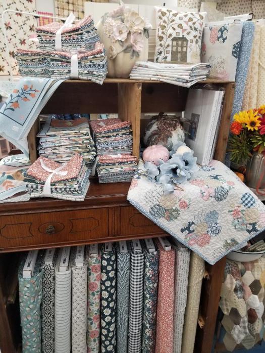this lovely washed out collection is definitely a fusion of cottage and farmhouse. soft and sweet tones of blue and pink pair with washed black, dark blue, and cream. This collection has the perfect ticking stripe…perfect for some border appliqué or a binding.
