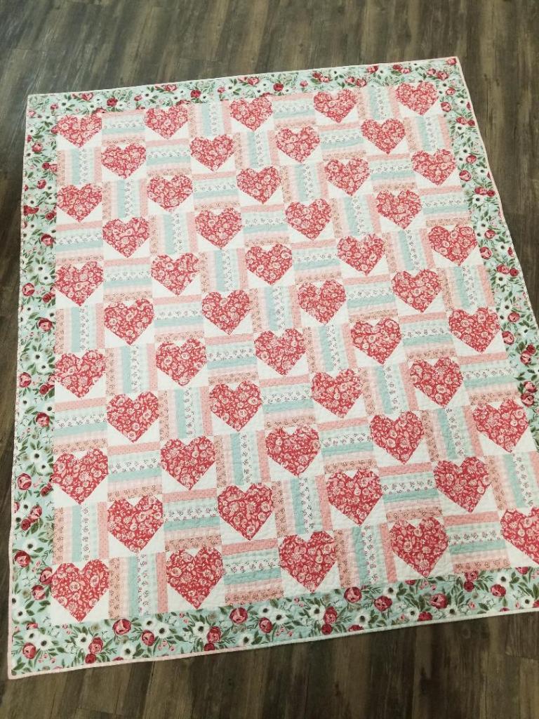 introducing…Heart Cakes…measuring 62 x 74 inches…it features hearts and rails…a lovely floral border and a candy sweet scrappy binding. it has everything your Valentine’s Day display needs. Just add a bowl of chocolates and you are good to go.