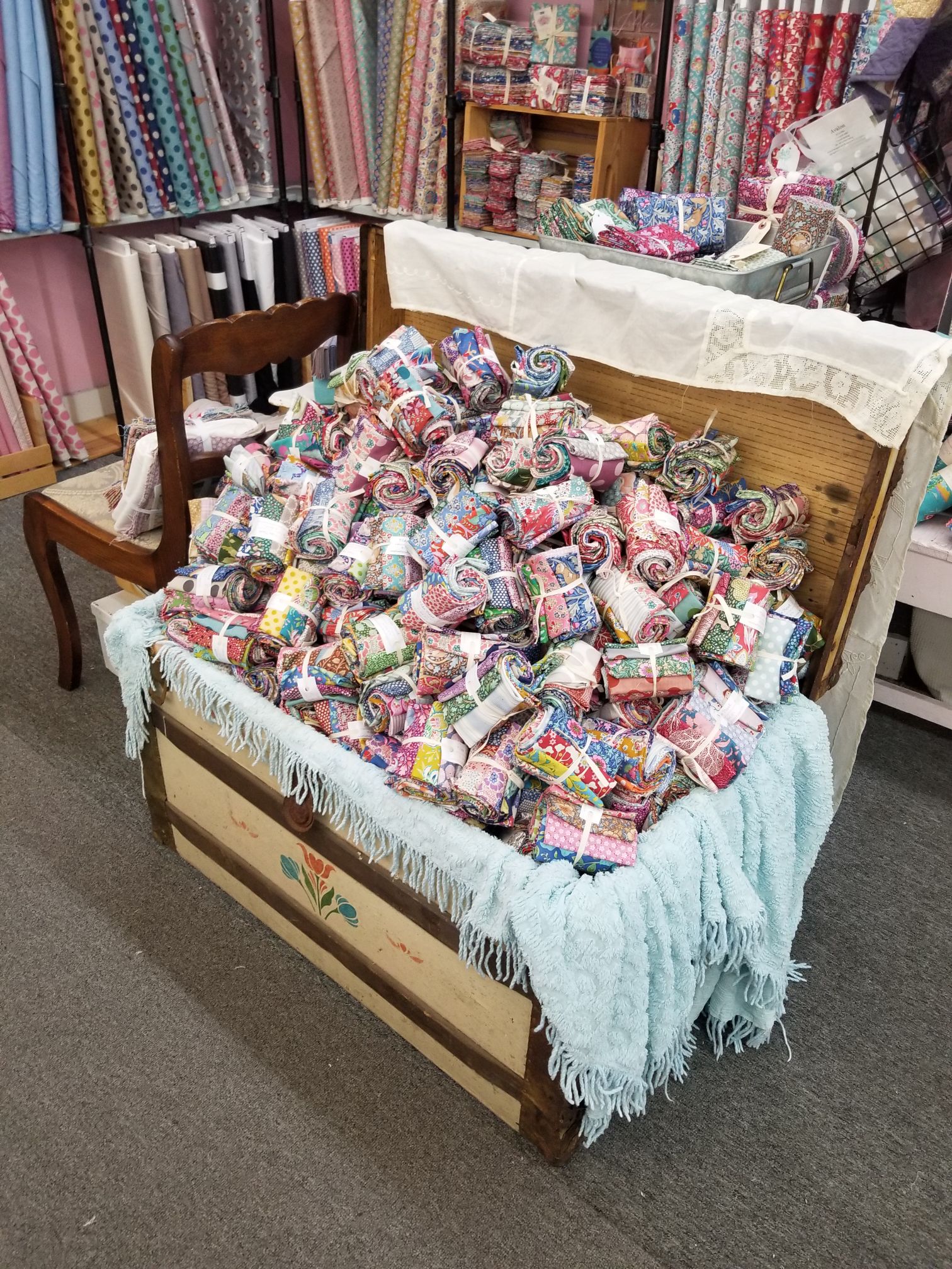 i spent yesterday rolling tilda treats…400+ rolls of delicious tilda. each bundle contains 8–fat 8ths from 8 different collections. we’ve been filling a wicker clothesbasket with mis-cuts, bolt ends, leftovers from projects… all cut into 8ths…and 2 1/2 inch strips for the 7-petal chrysanthemum (Rosewood Blooms). hoping to get that kitted up real soon. anyways…treats are a mixture of main collections and basics (we don’t cut up the solids or chambray).
