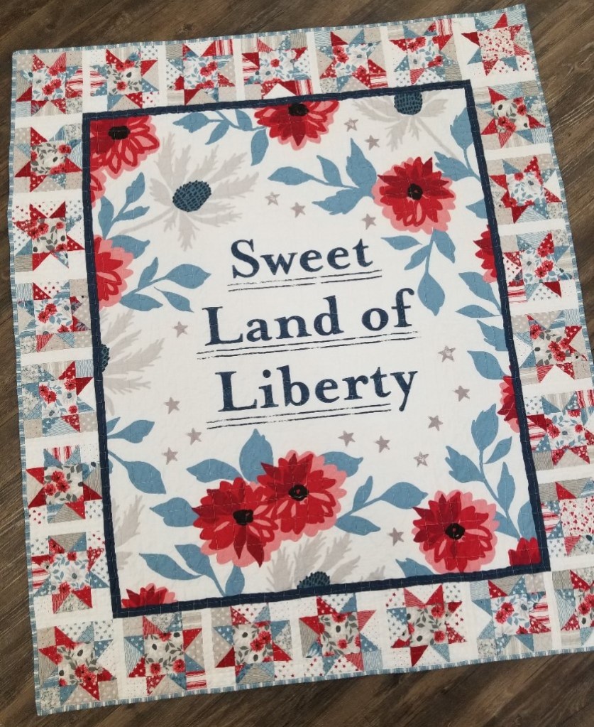first off…Parade Day…featuring the Sweet Land of Liberty panel from Old Glory. We pair it with a handful of stars to make it 47 x 54 inches. After we pulled it out of the dryer, we draped it over the porch swing. PERFECTION! It looked amazing with the bunting and the potted red, white, and “blue” petunias! Didn’t really want to put it up a the shoppe…but thought we better since we have some kits. (you can find them here.)