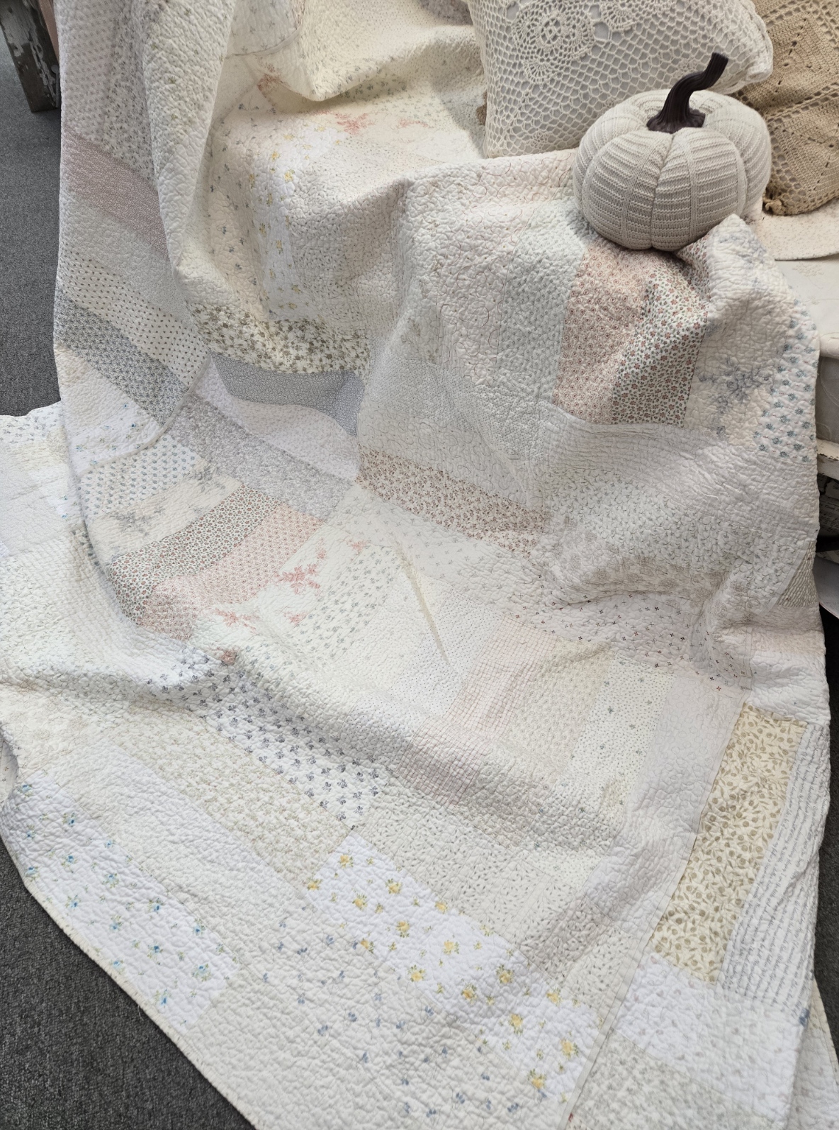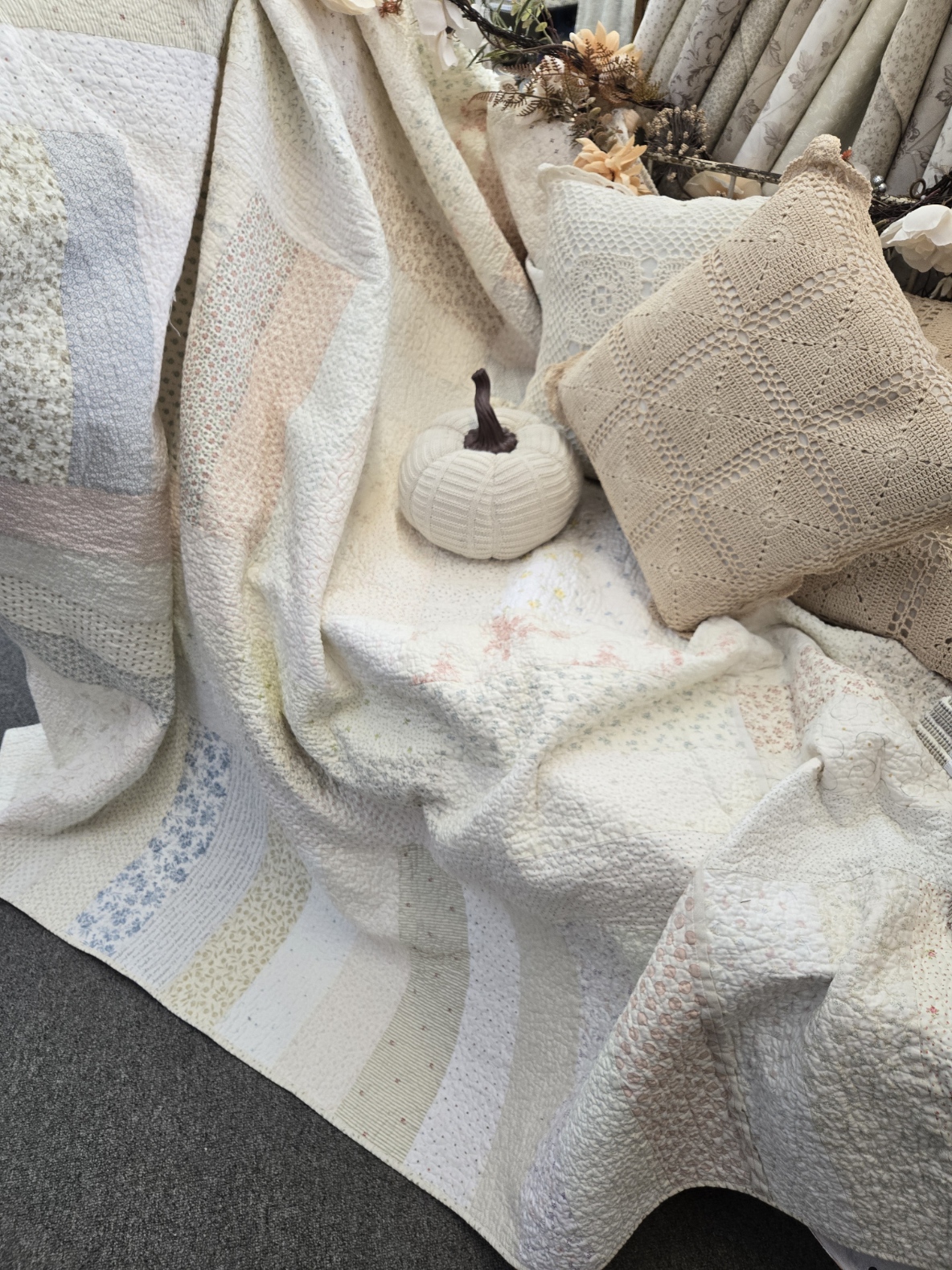 bliss is one of our new favorites. a soft and subtle low volume palette. a perfectly neutral quilt that is a wonderful year round quilt…just change out the pillows and décor to suit the season.