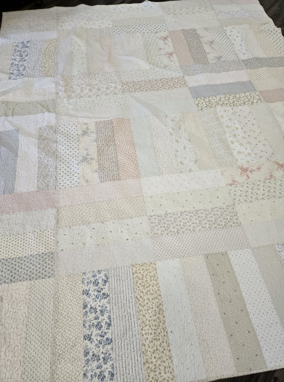bliss measures approximately 80 x 96 inches and features 60 low volume prints and 2 columns of cream piping.
