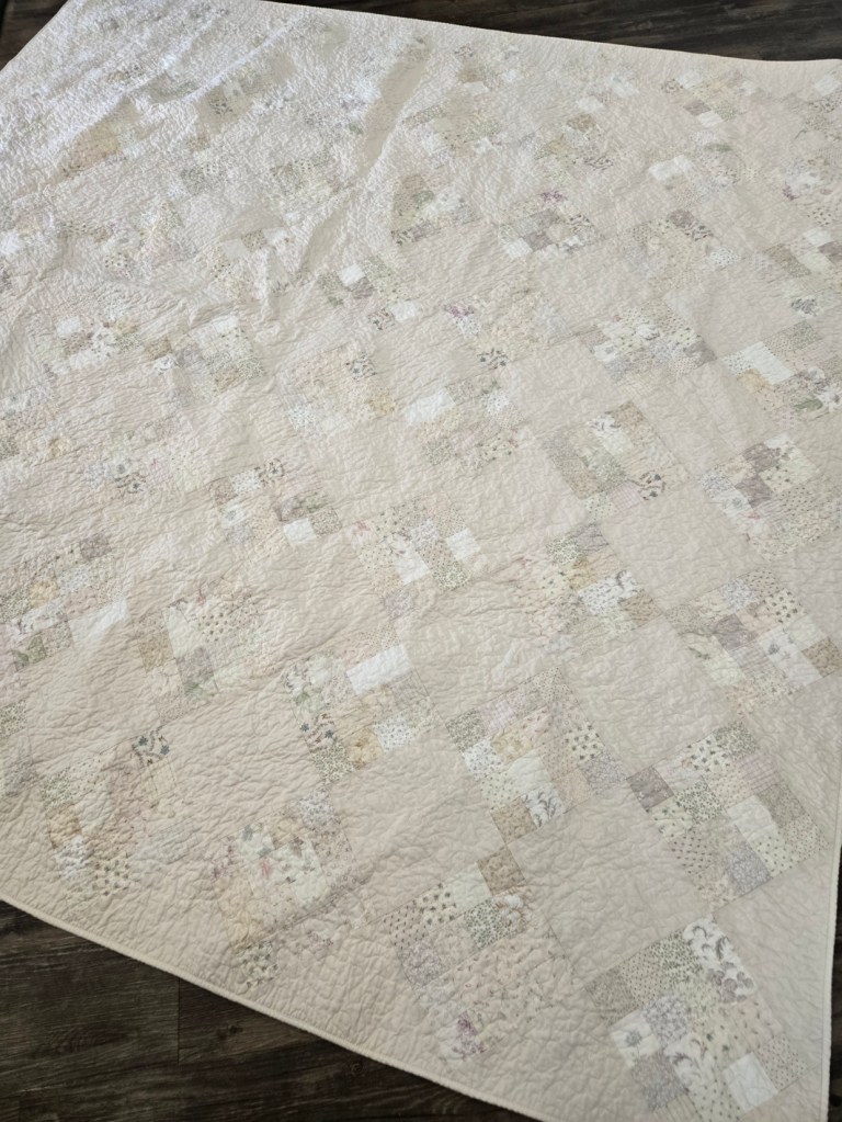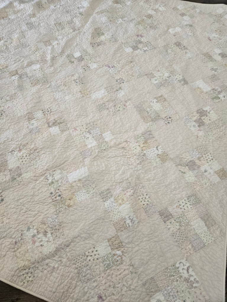 Vanilla Bean measures 89 x 89 inches and features low volume 16-patch blocks off-set with a Bella Muslin. a perfect neutral backdrop for the holiday season whether you are adding Christmas baubles or Easter Baskets.