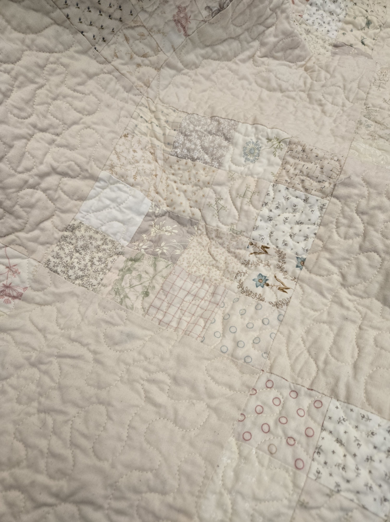 Vanilla Bean measures 89 x 89 inches and features low volume 16-patch blocks off-set with a Bella Muslin. a perfect neutral backdrop for the holiday season whether you are adding Christmas baubles or Easter Baskets.