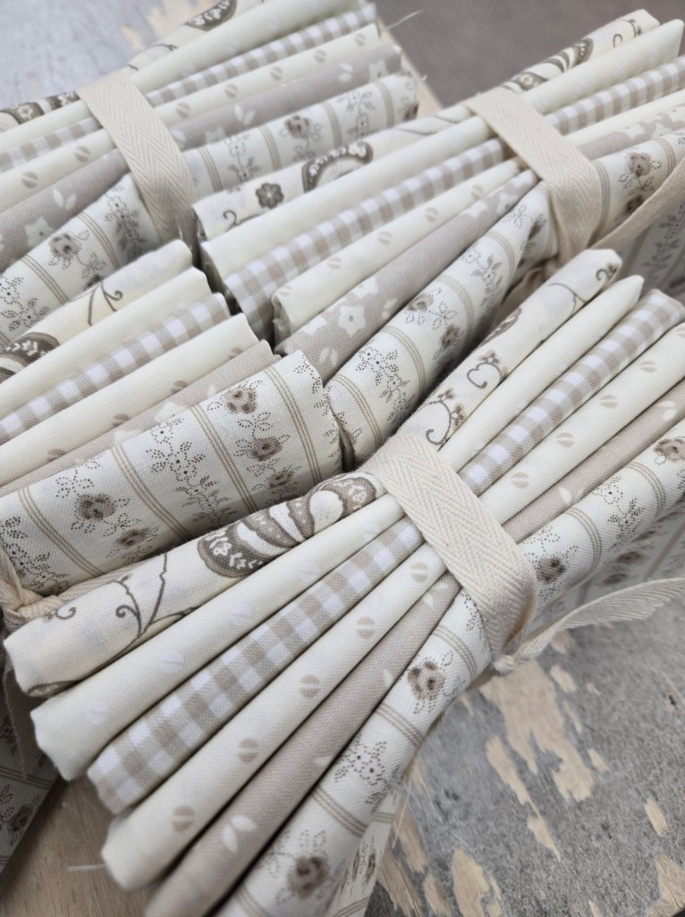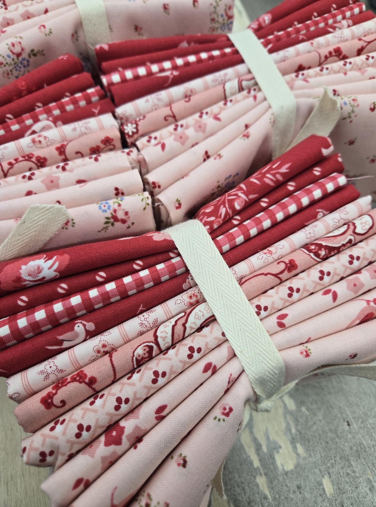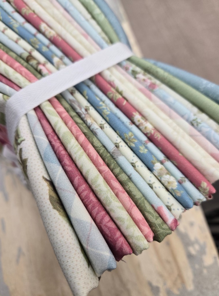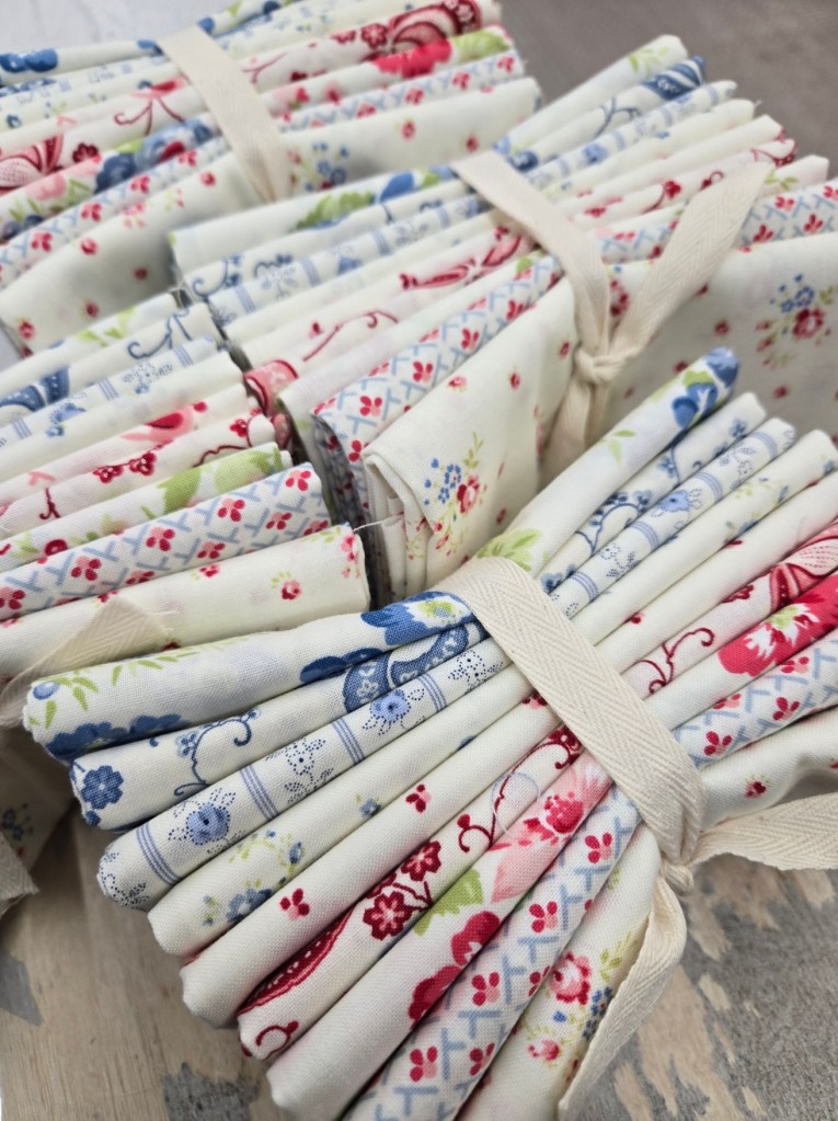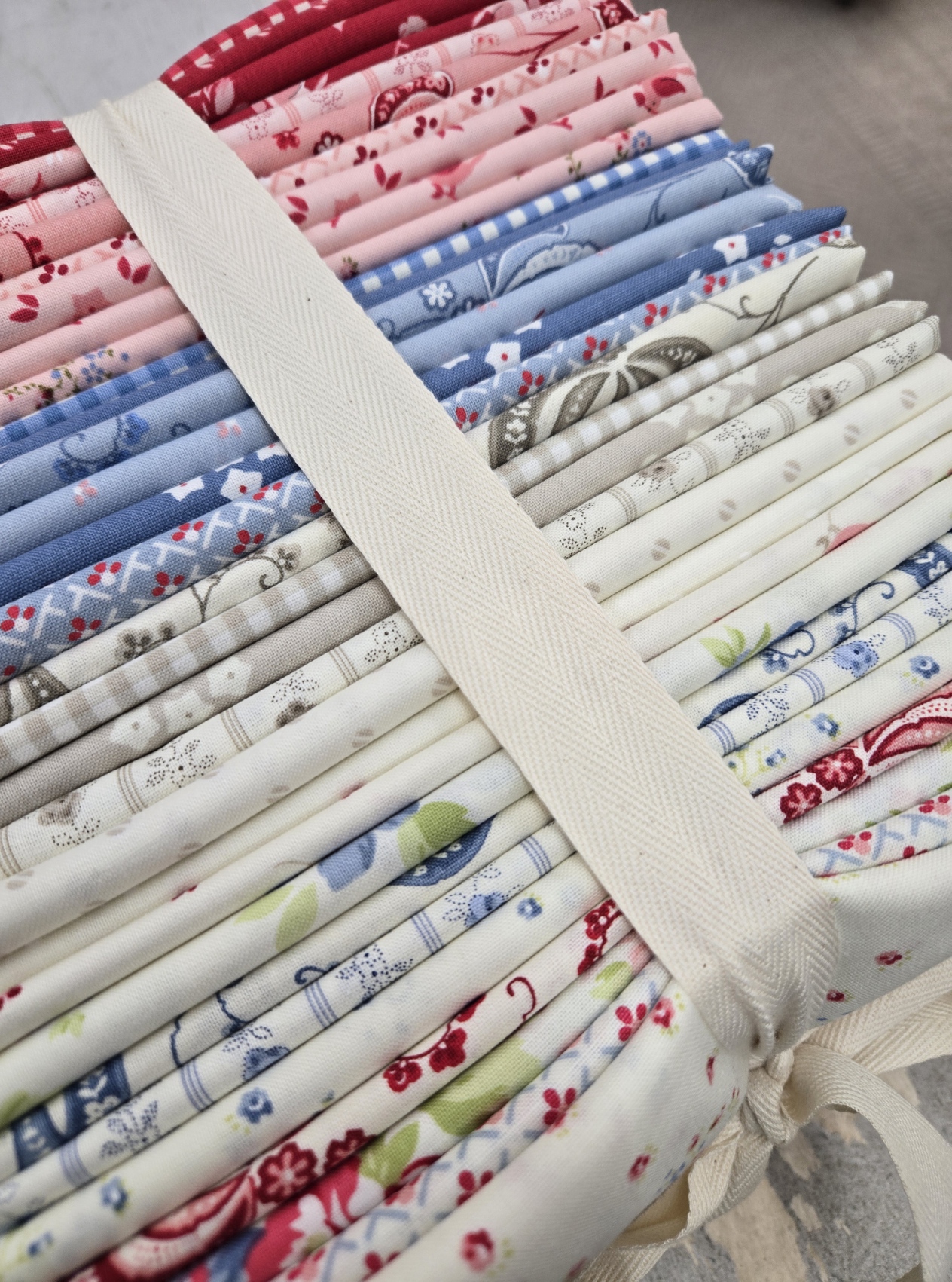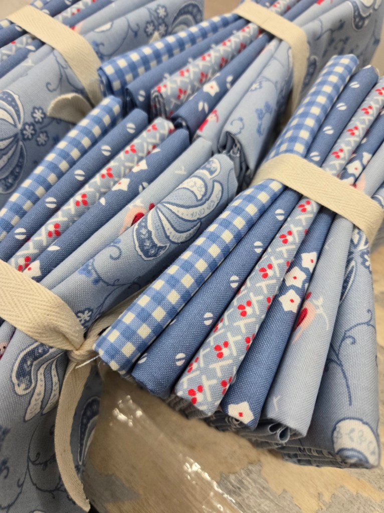 Hollyhocks & Roses by Bunny Hill, washed-out, cottage-style Americana comes to mind. this collection is full of pretty florals, plaids and dots in a palette of Hollyhock Pink, Bluebell, Linen, Sky, Carnation Pink and Jasmine White. It reminds me of Sweet Liberty by Brenda Riddle…cottage-y and wonderful when mixed with Bella Bleach. Mom is currently working on a project…more on that once it is finished up. we do have factory precuts along with FQ and Half Yard bundles of the different colors. i couldn’t pick just 1 colorway to show…so i grabbed a pic of each. the collection and precuts can be found here…i’ve put them in the Independence.Day section…