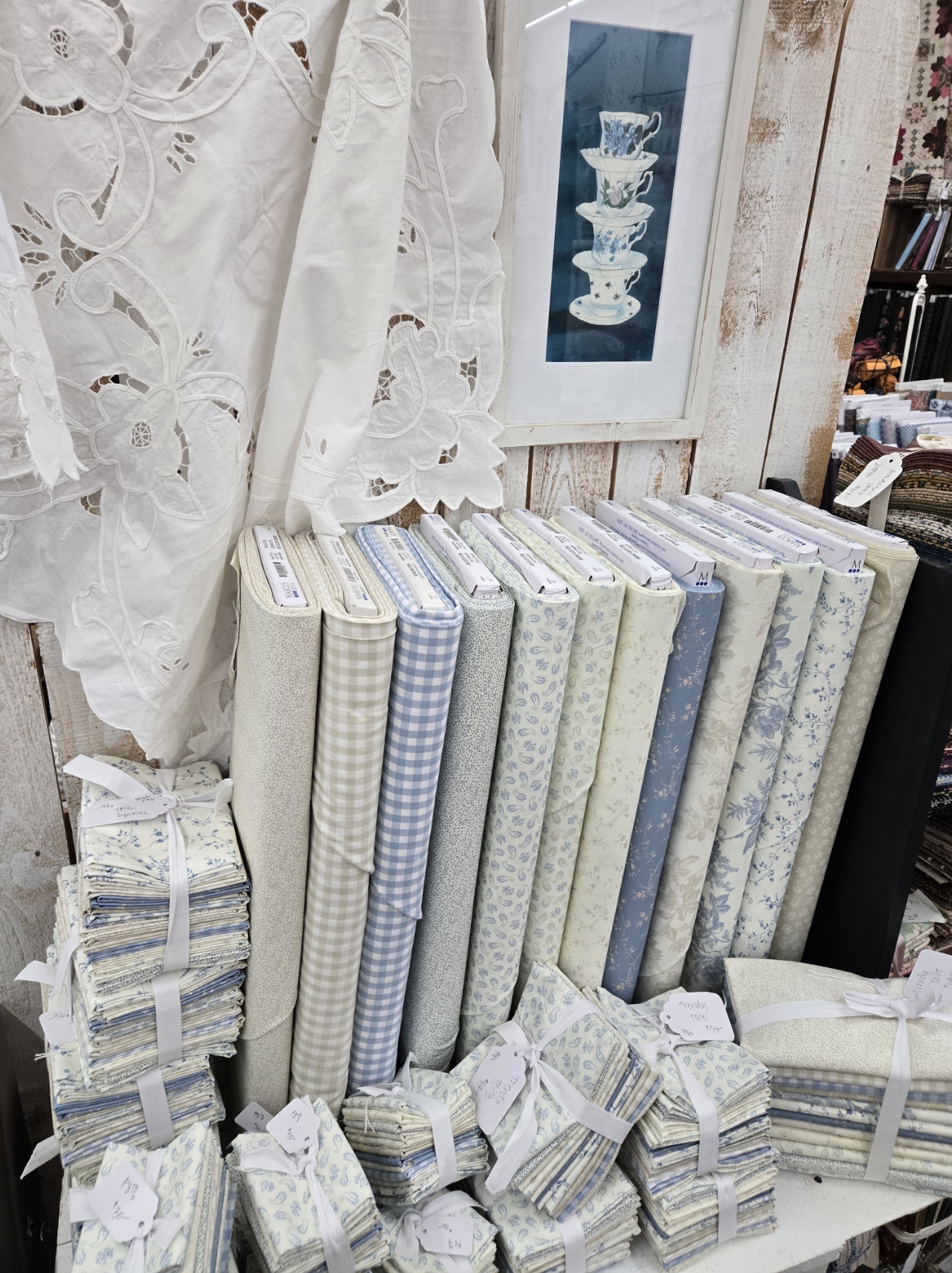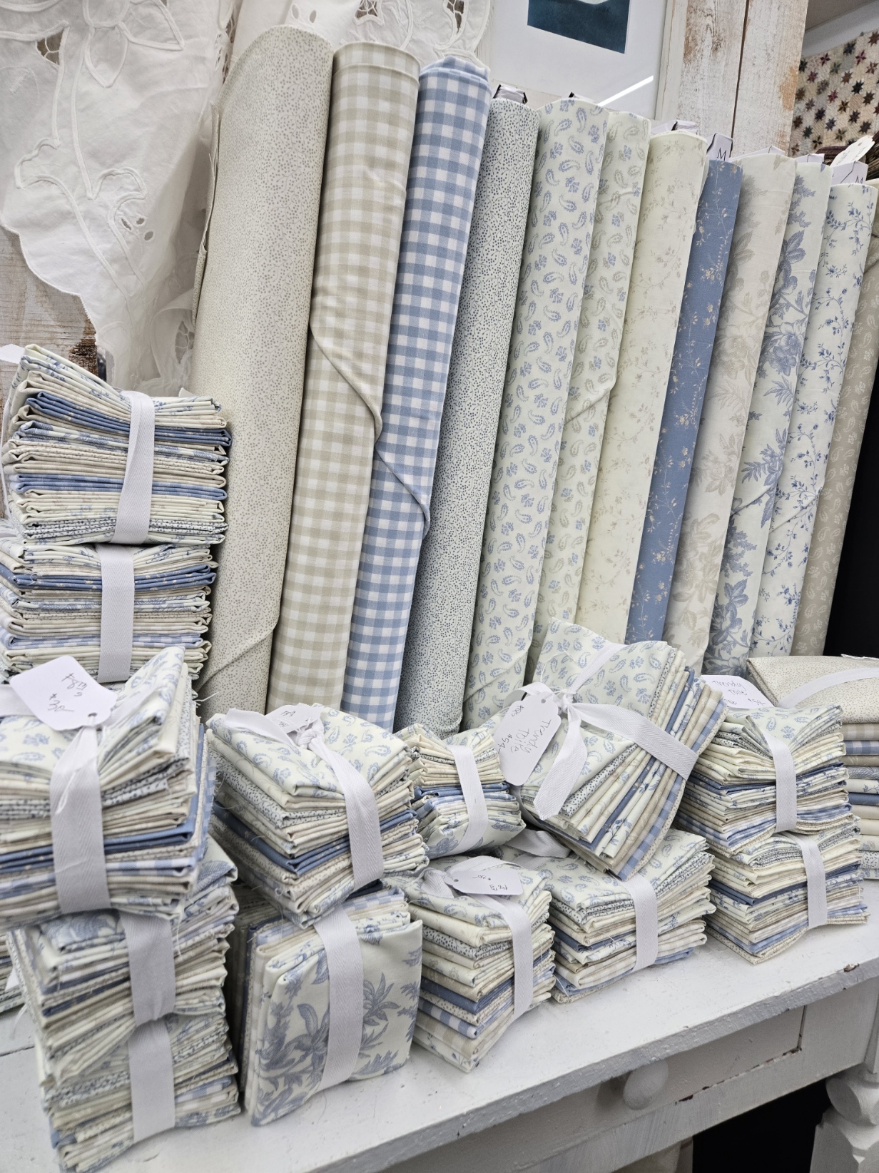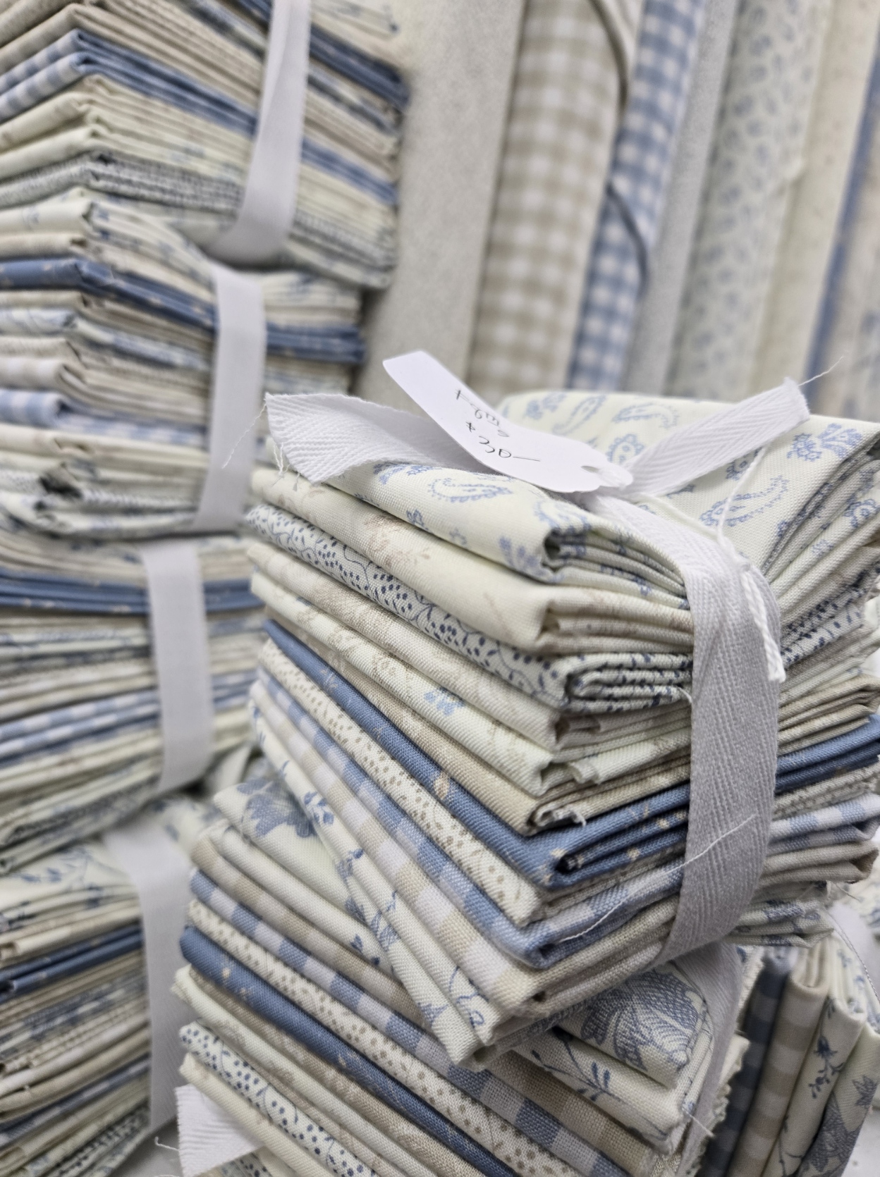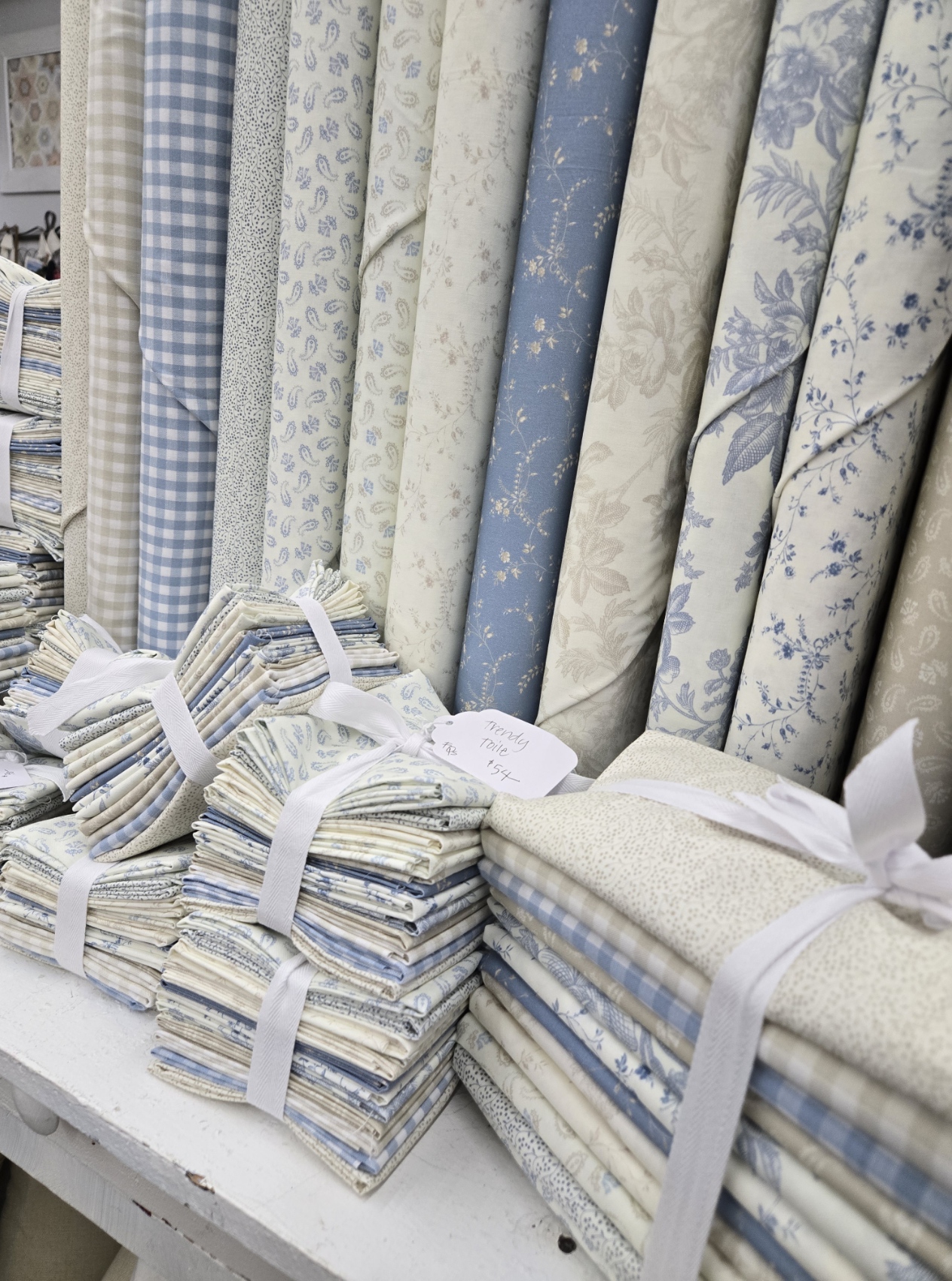 HOWEVER, we were quick this time around…trendy toile arrived yesterday, and we cut f8th, FQ, HY, and ONE YARD bundles…then last night i folded and tied everything. then popped everything online today.