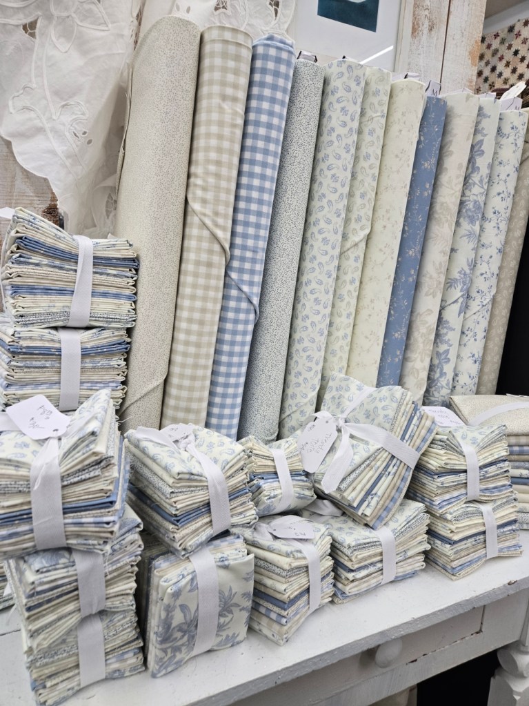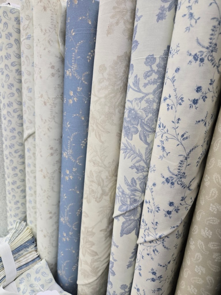 now…back to Trendy Toile. i love blue. (if i’m honest i love all the colors…they all have their place…however, blue has my heart!) so when we saw this sweet little set of 12 prints in shades of cream and beige, blue and sky it was a must. mom is planning a log cabin…a remake of our Cozy Cottage quilt…white sashing and border…blue binding…and a crochet edge. we’ll see how that plays out…sometimes before we’ve started it…something else comes along and is a better fit.