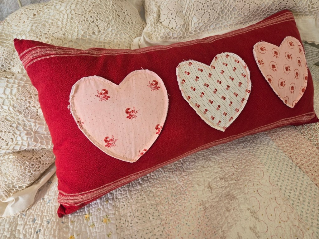 *3 of Hearts pillow…this pillow features 2 color options…both a classic with a red toweling and a Romantic Prairie grey toweling with mauve pink hearts. 3 of hearts kits can be found here.