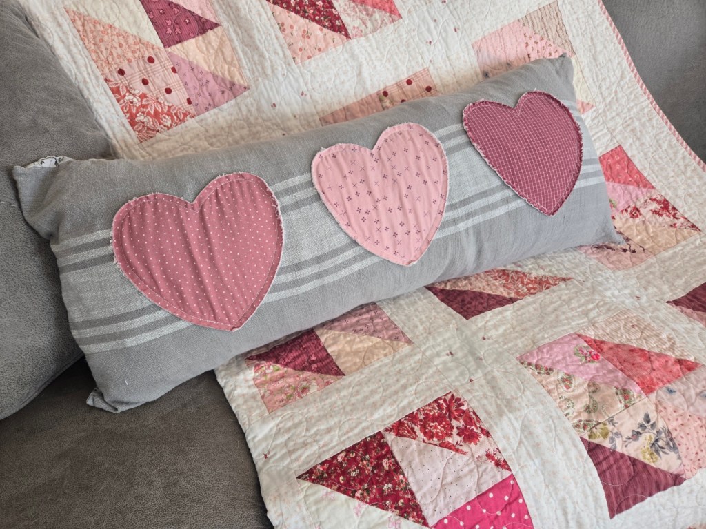 countryside valentine…the quilt under the 3 of Hearts pillow above. we have it available with different sashing options…you can find the kit here.