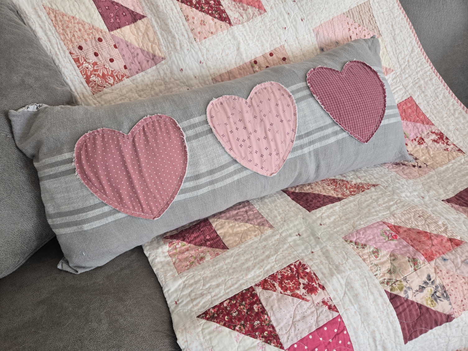 countryside valentine…the quilt under the 3 of Hearts pillow above. we have it available with different sashing options…you can find the kit here.