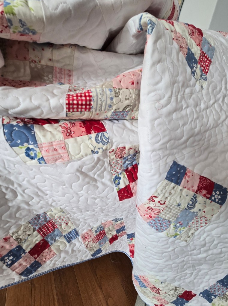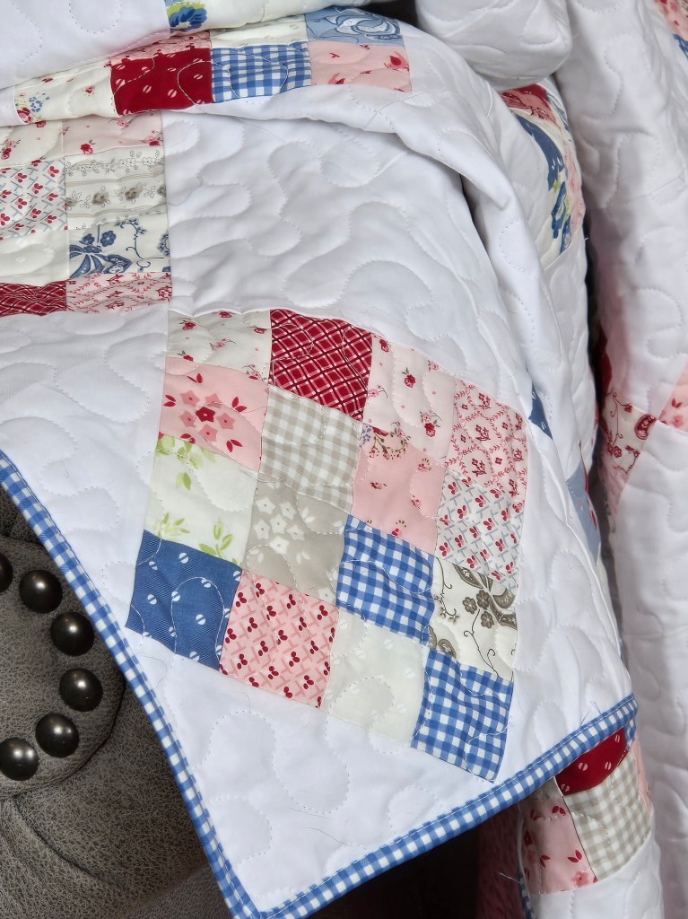 the other lovely we have nearly ready…just have to finish up the crochet edge is our new version of our Cozy Cottage quilt featuring the Trendy Toile. love that extra large Fableism Camp Gingham backing…yummy!