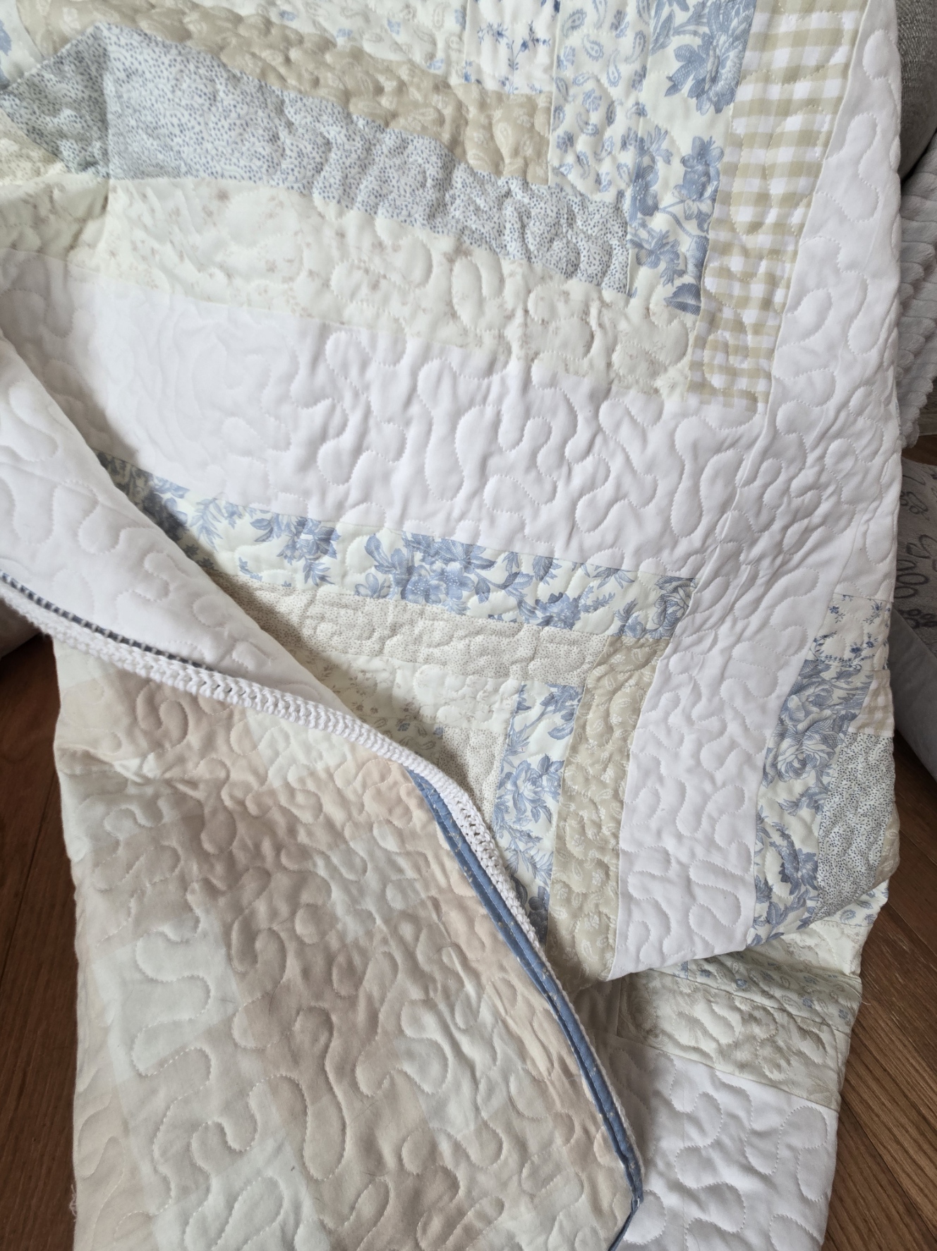 the other lovely we have nearly ready…just have to finish up the crochet edge is our new version of our Cozy Cottage quilt featuring the Trendy Toile. love that extra large Fableism Camp Gingham backing…yummy!