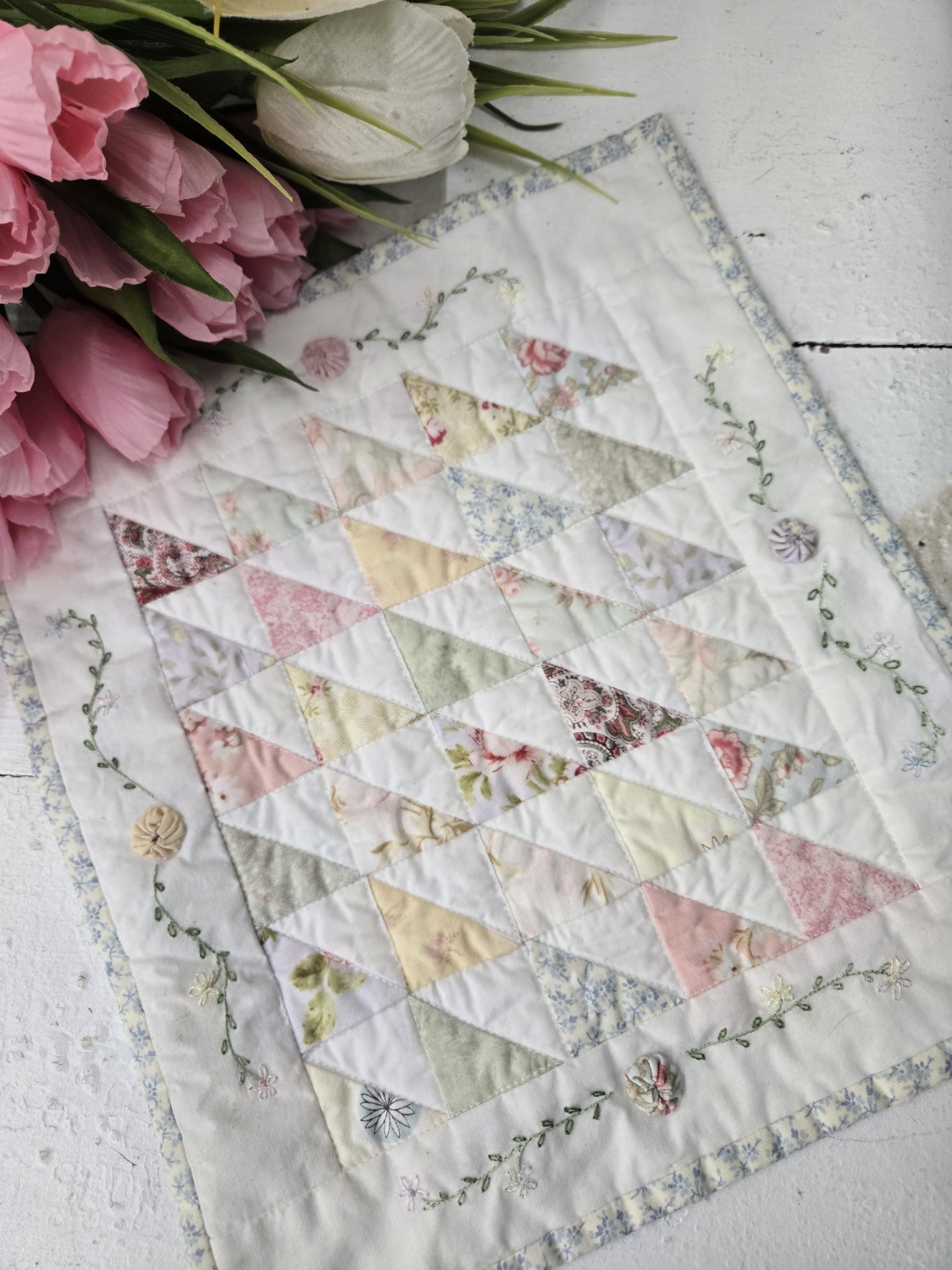 i would like to (re)introduce…Angel Cake, a sweet confection, features half-square triangles, embroidery, and several yoyos. she has been kitted up with gorgeous florals and measures a mere 11 x 12 inches and could be finished and added to a mini wall, dropped into a frame, or using on a doll bed.
