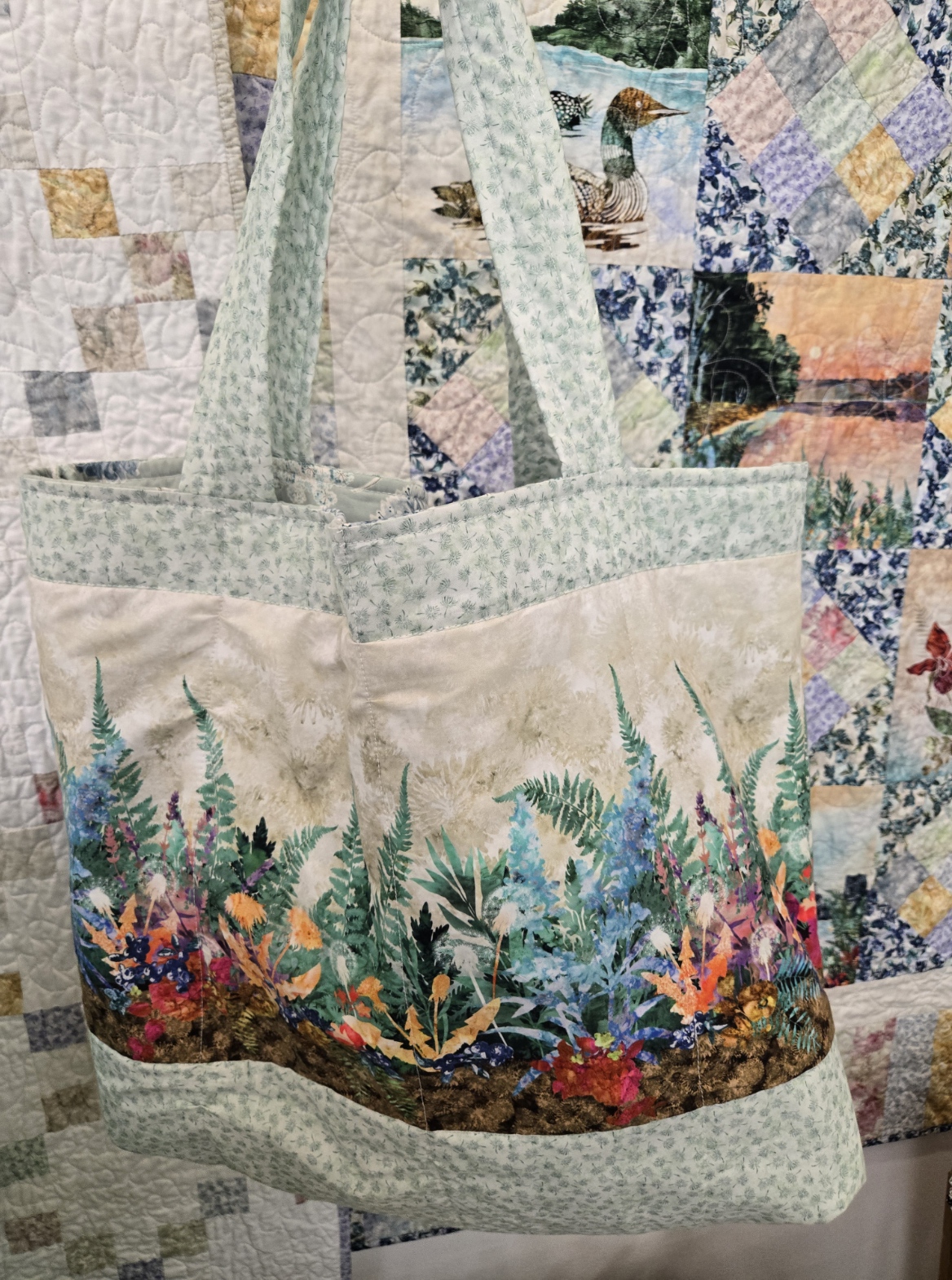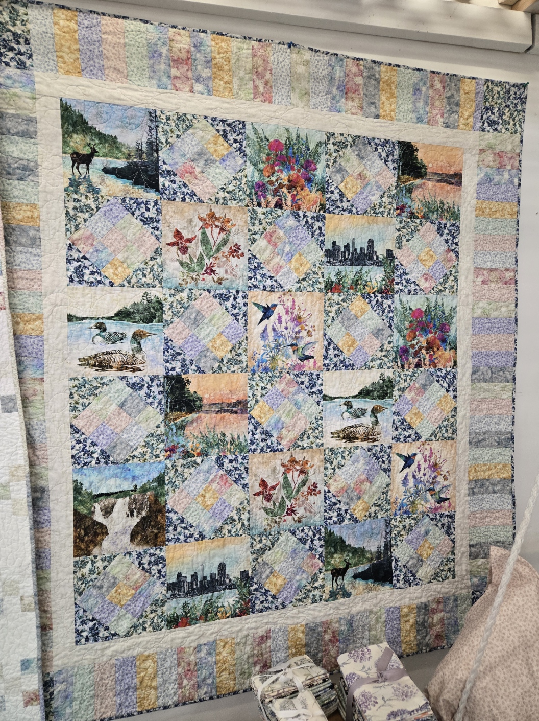 Scenic Route…inspired by trips to the North Shore…this quilt features the 8 inch panels and a wide array of Quilt Minnesota prints. Measuring 59 x 67 inches…Scenic Route kits include binding for $115+booklet.