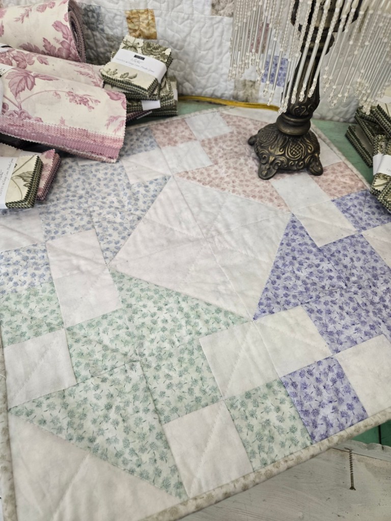 first up is Minnesota Starburst…the namesake of our booklet. This topper measures just 16 x 16 inches and features our Starburst block. kit is complete with backing and binding and is $39+booklet.