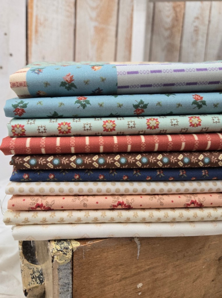 we have a few projects that are we are finishing up…but today i’m here showing you Sheryl’s Patchwork Potpourri. This delightful little collection is full of the loveliest civil war prints. the palette is a fun combo of mint, chocolate, dark blue, peachy pink, and cream. the preprinted patchwork cheater would make a fun and quick tablerunner if you need a quick runner to use under your pumpkins and bowl of autumn cross stitch littles. it would also coordinate wonderfully with those amazing heirloom pumpkins!