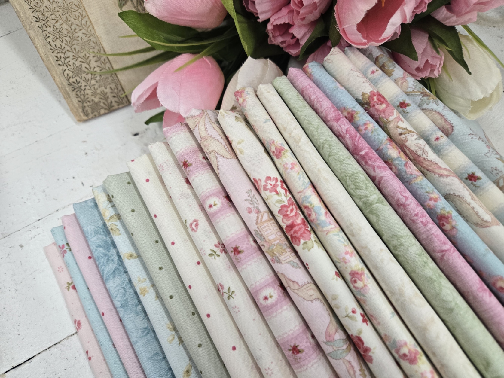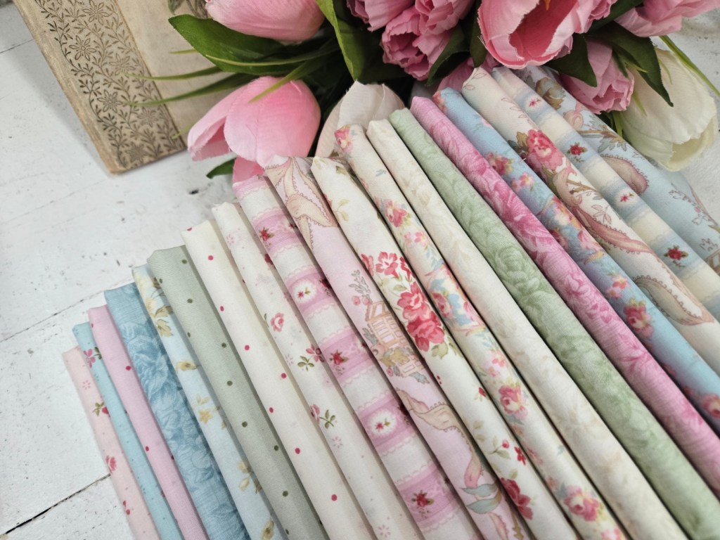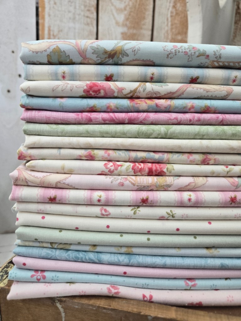 a lovely collection showcasing gentle roses, a pastel palette, pin dots, tonals, and the loveliest rosebud stripe.