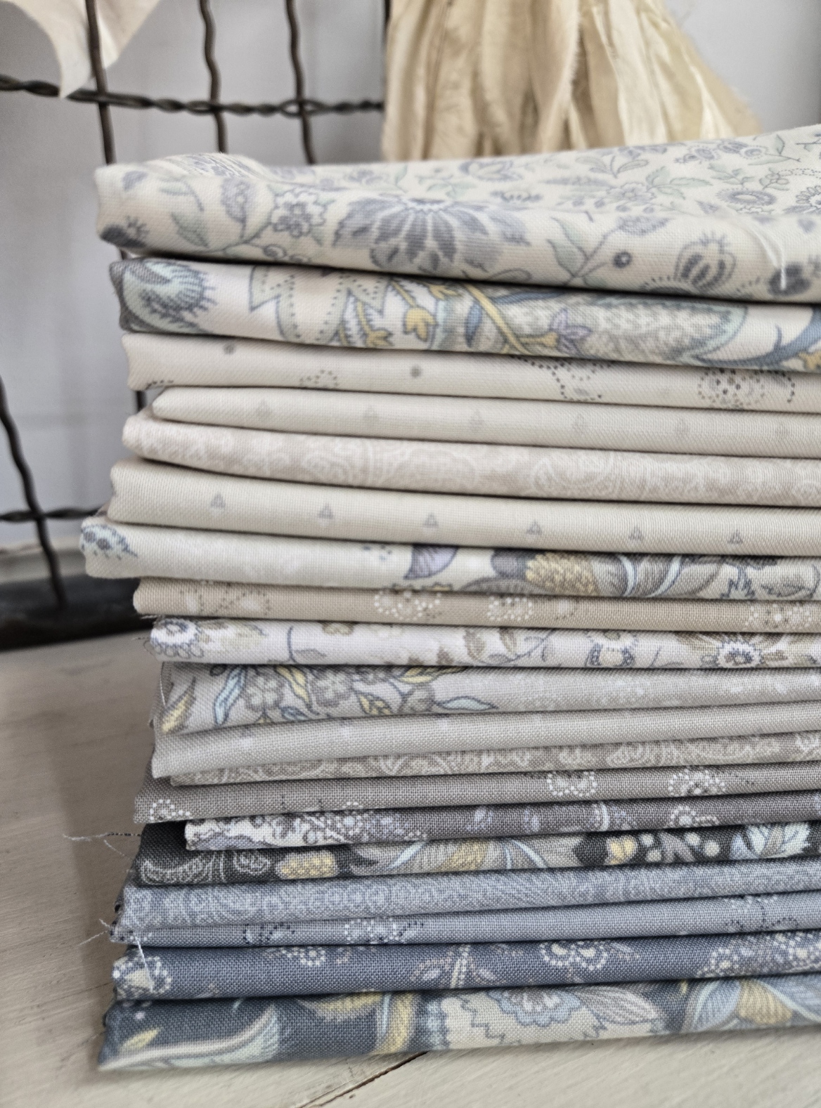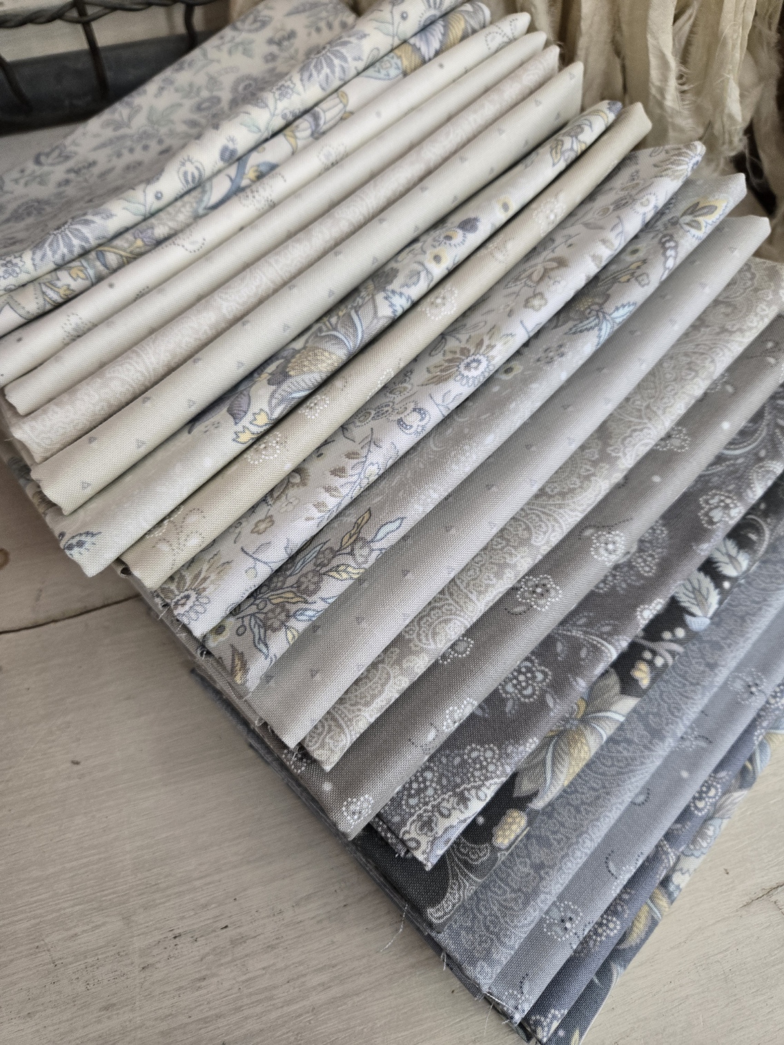 a collection filled with both dark and light neutrals…perfect for sprucing up your collection. shades of grey, beige, taupe, and blue in large border-style prints as well as smaller florals, dots, and lacey paisleys.