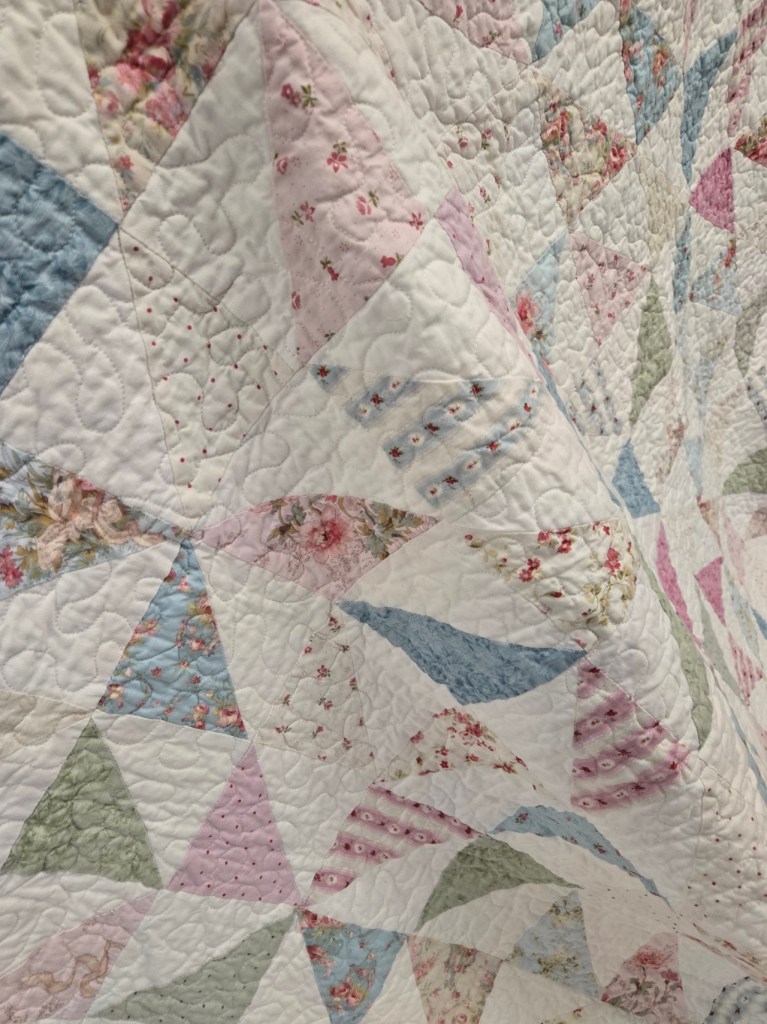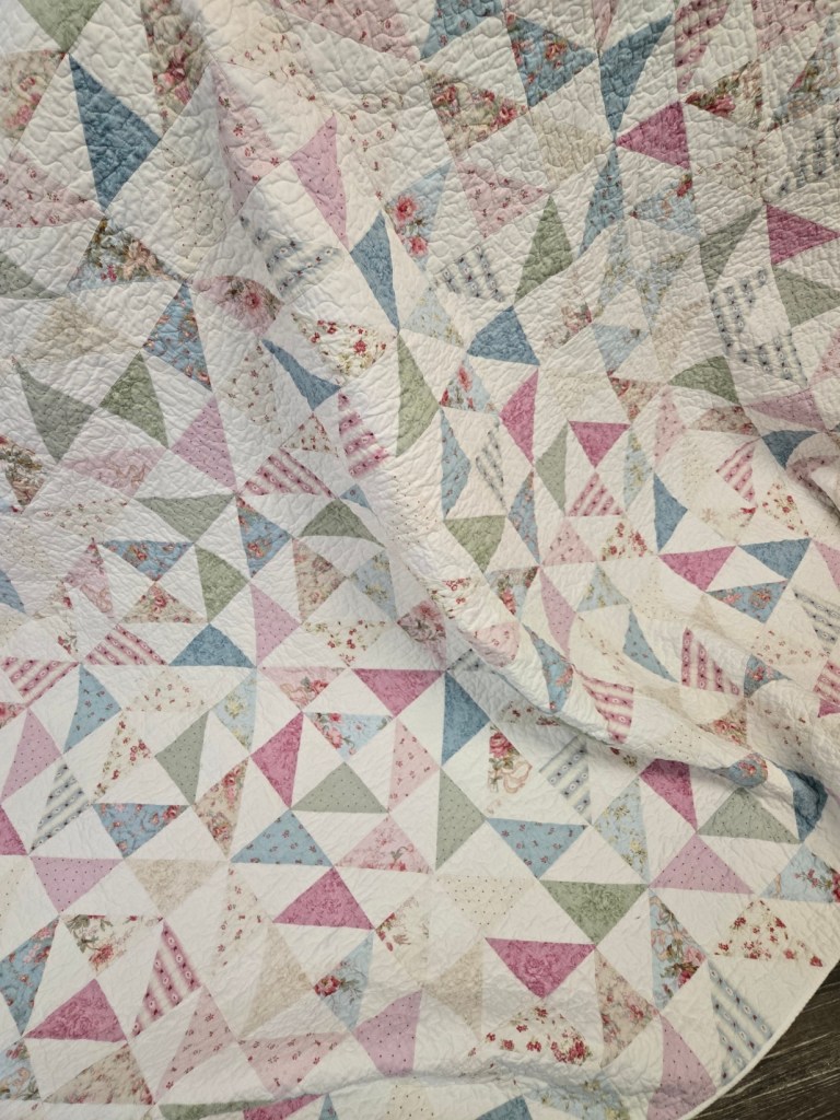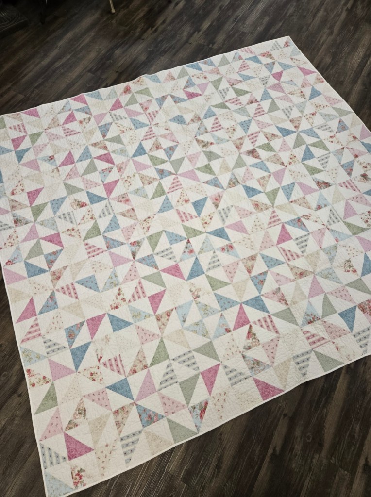 using an infusion of Charlotte by Clothworks and our favorite Bella solid bleach…we’ve created a pastel wonderland. lots of half square triangles create a free flowing classic quilt. a perfect size at approximately 84 x 95 inches.