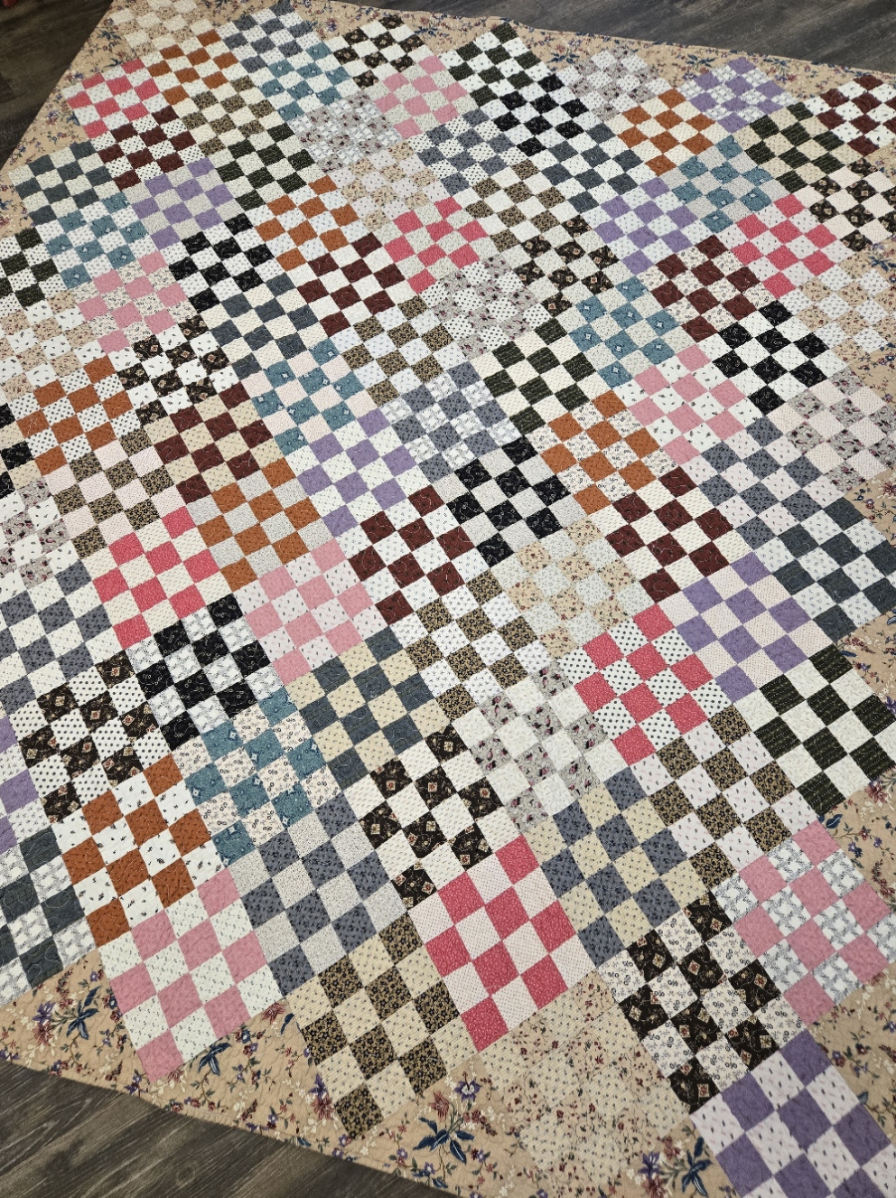 she measures 78 x 89 inches and is kitted up with all the fat quarters and the delicious Return to Elegance floral that is featured in the setting triangles and binding.