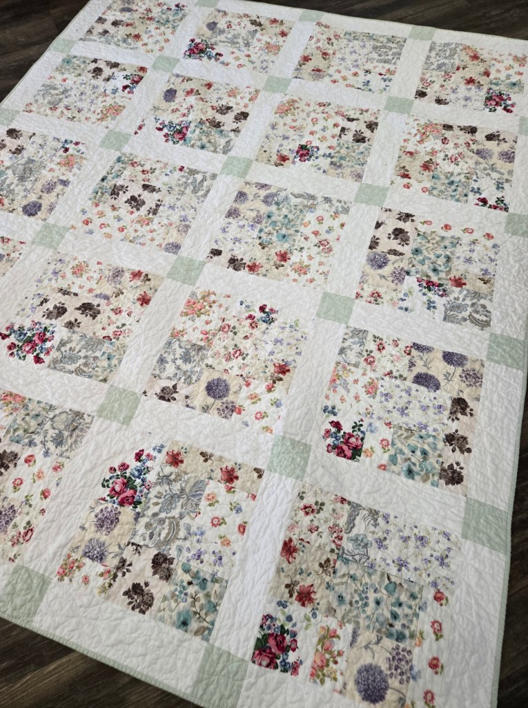 lovelier…a combination of white background florals, a minty green, and our favorite bella white. i love low volume prints and these larger florals that are cut up and then pieced into a square give it a collage look which just adds more whimsy to the entire quilt. lovelier is kitted up and ready to go in store or online here. she measures about 63 x 78 inches…so perfect for an early spring evening spent on the porch, or wrap up with it by the fire as you open up the seed catalog and get ready for spring.